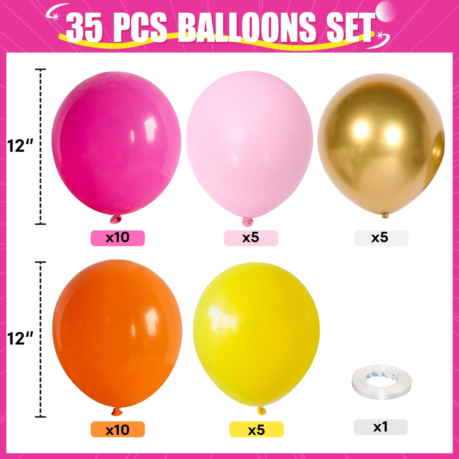 Pink Orange Yellow Balloons:You will receive this 35pcs 12-inch pink orange yellow balloons, which includes 5 colors. 10pcs matte hot pink balloons, 10pcs matte orange balloons, 5pcs pastel pink balloons, 5pcs matte yellow balloons, 5pcs metallic gold balloons. Accompanying by a 10M ribbon. Summer pink yellow and orange colored decoration will embellish your theme party!