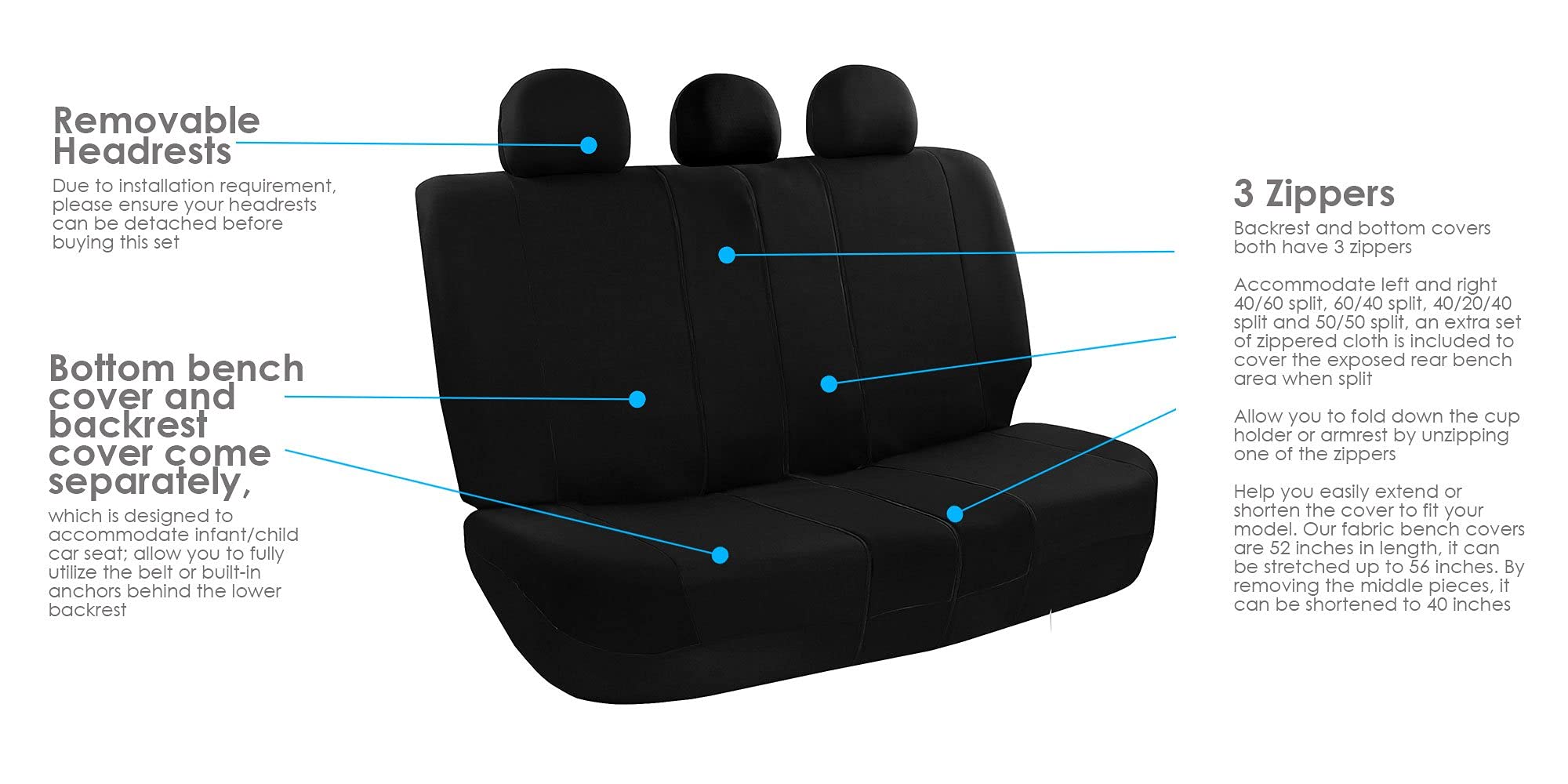 UNIVERSAL FIT CLOTH SEAT COVERS FOR CARS, SUVS, TRUCKS: These universal car seat covers offer a secure fit in sedans, trucks, and SUVs while protecting against spills, dirt, and pet hair. Perfect for drivers seeking full coverage seat protection with durable fabric in stylish options like black, red, blue, purple, pink, or grey to match any interior.