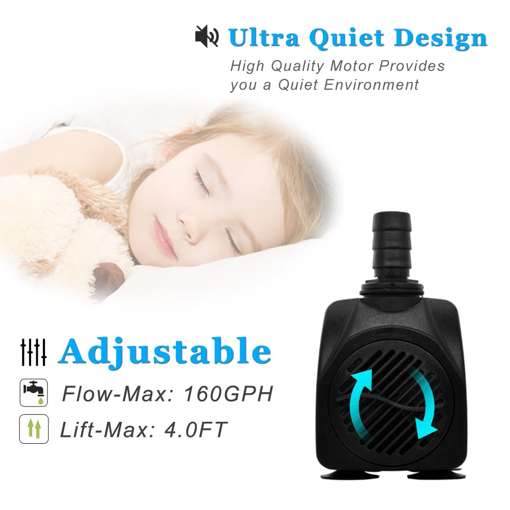 Adjustable Flow: The pump equip with flow valve, you can set the flow rate freely, maximum flow rate:160GPH, maximum lift:4.0ft.