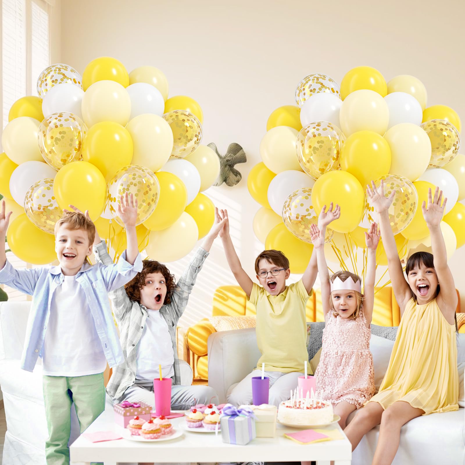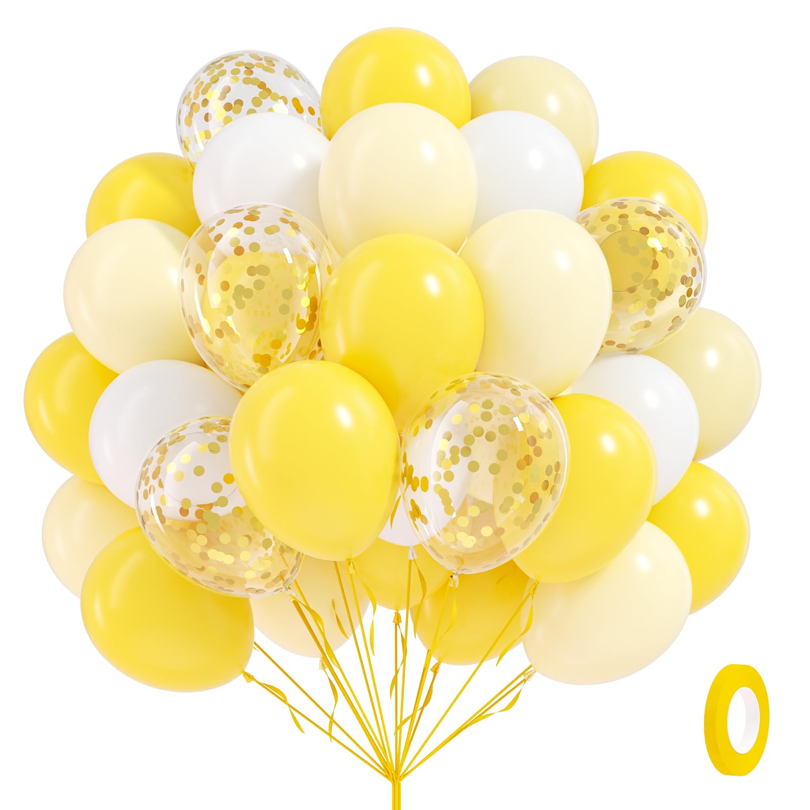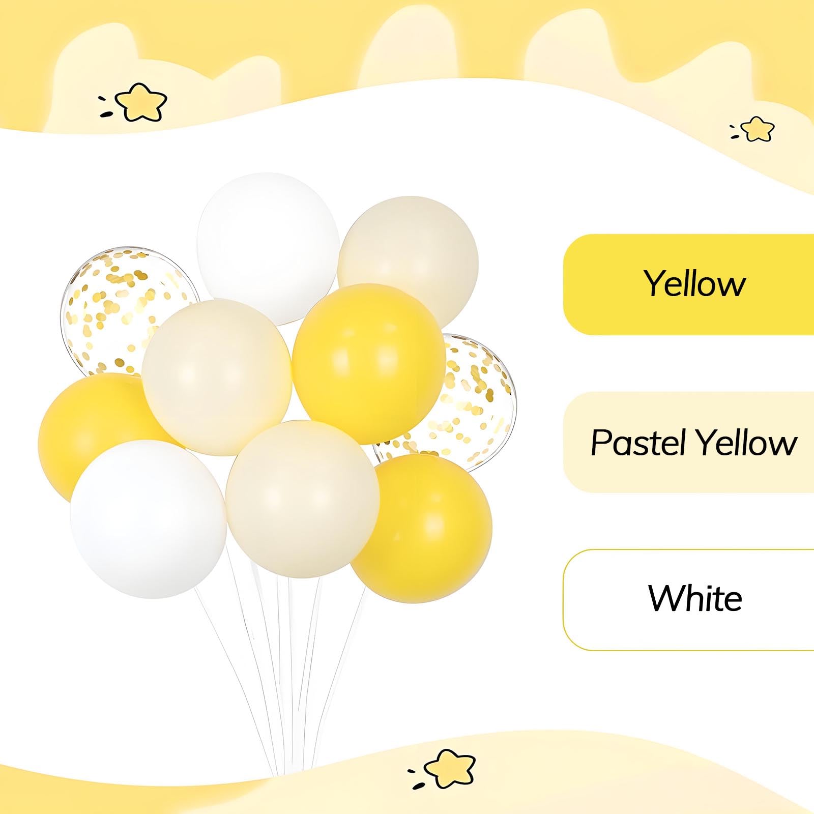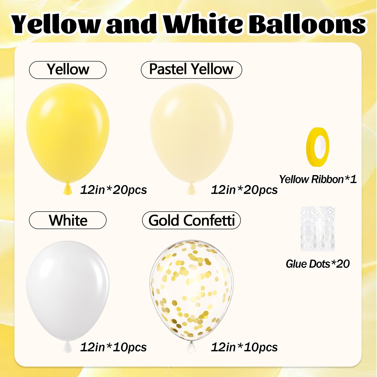 Package Include: The yellow and white balloons include 12inch yellow balloonsx20, 12inch pastel yellow balloonsx20, 12inch white balloonsx10, 12inch gold confetti balloonsx10, glue dotsx20, yellow ribbonx1