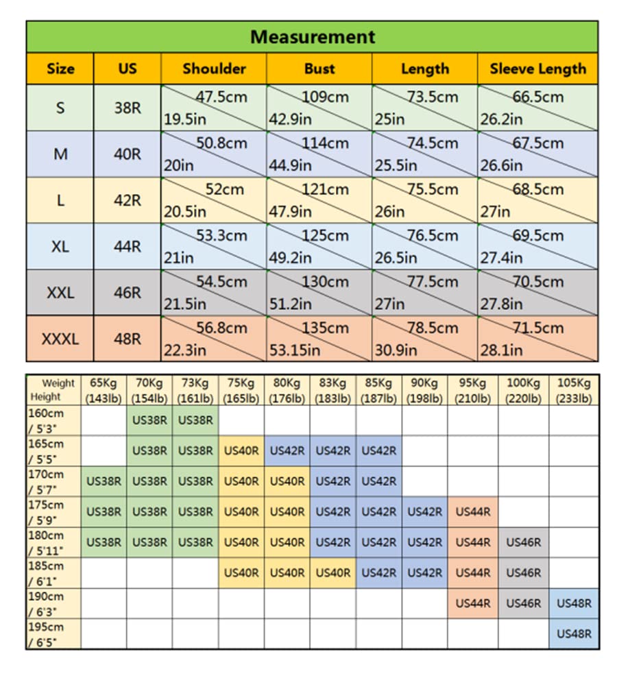 Size reference: S≈38R, M≈40R, L≈42R, XL≈44R, XXL≈46R, 3XL≈48R
