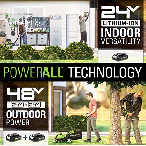 Two Greenworks 24V batteries combine for 48V of exceptional power without leaving the 24V battery platform.