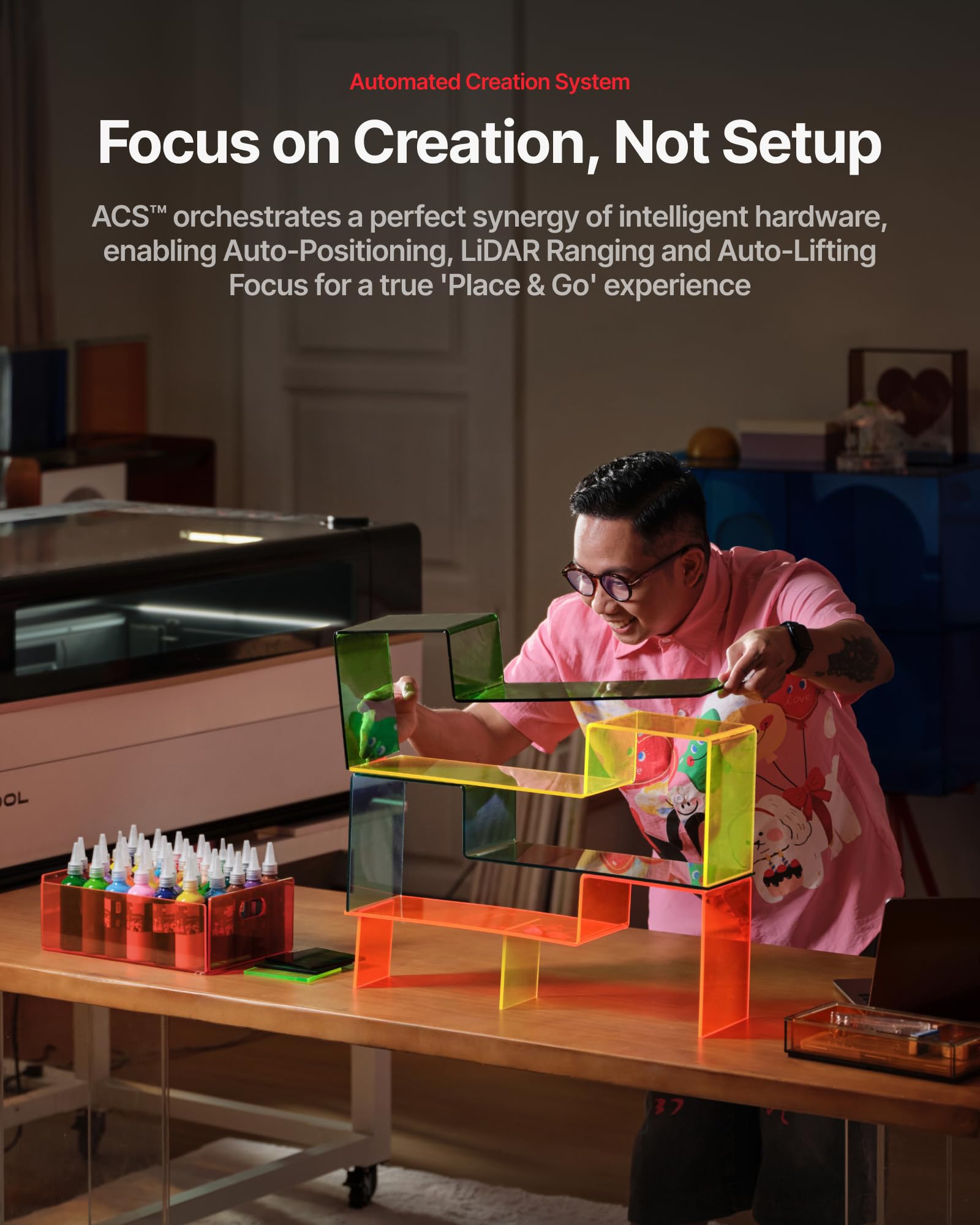 Revolutionary Automated Creation System: Experience a true "Place & Go" workflow. ACS integrates LiDAR ranging for perfect autofocus, dual HD cameras for precise positioning, & an AutoLift Base (up to 8.7" height) to automate setup, significantly simplifying the operation of this advanced CO2 laser cutter.