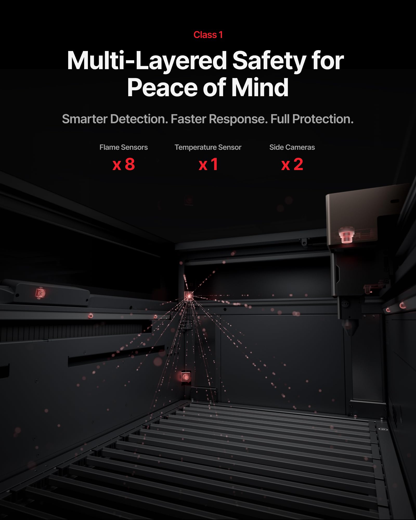 Class 1 Safety & Multi-Layered Protection: Work with total peace of mind. Features a fully enclosed Class 1 safety-rated design with lid interlocks, plus an active detection and suppression system and scrap buildup alerts for advanced protection on your high-performance laser engraver.