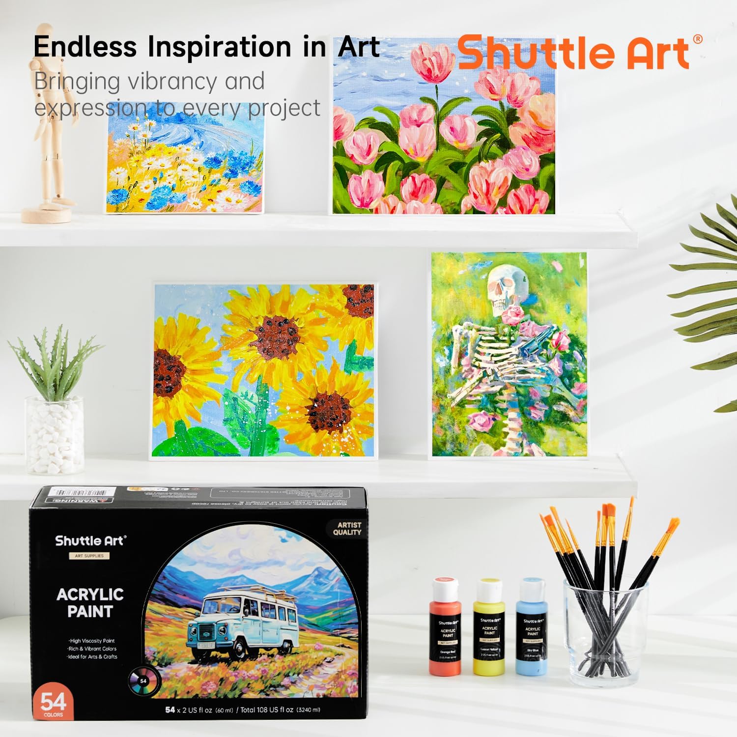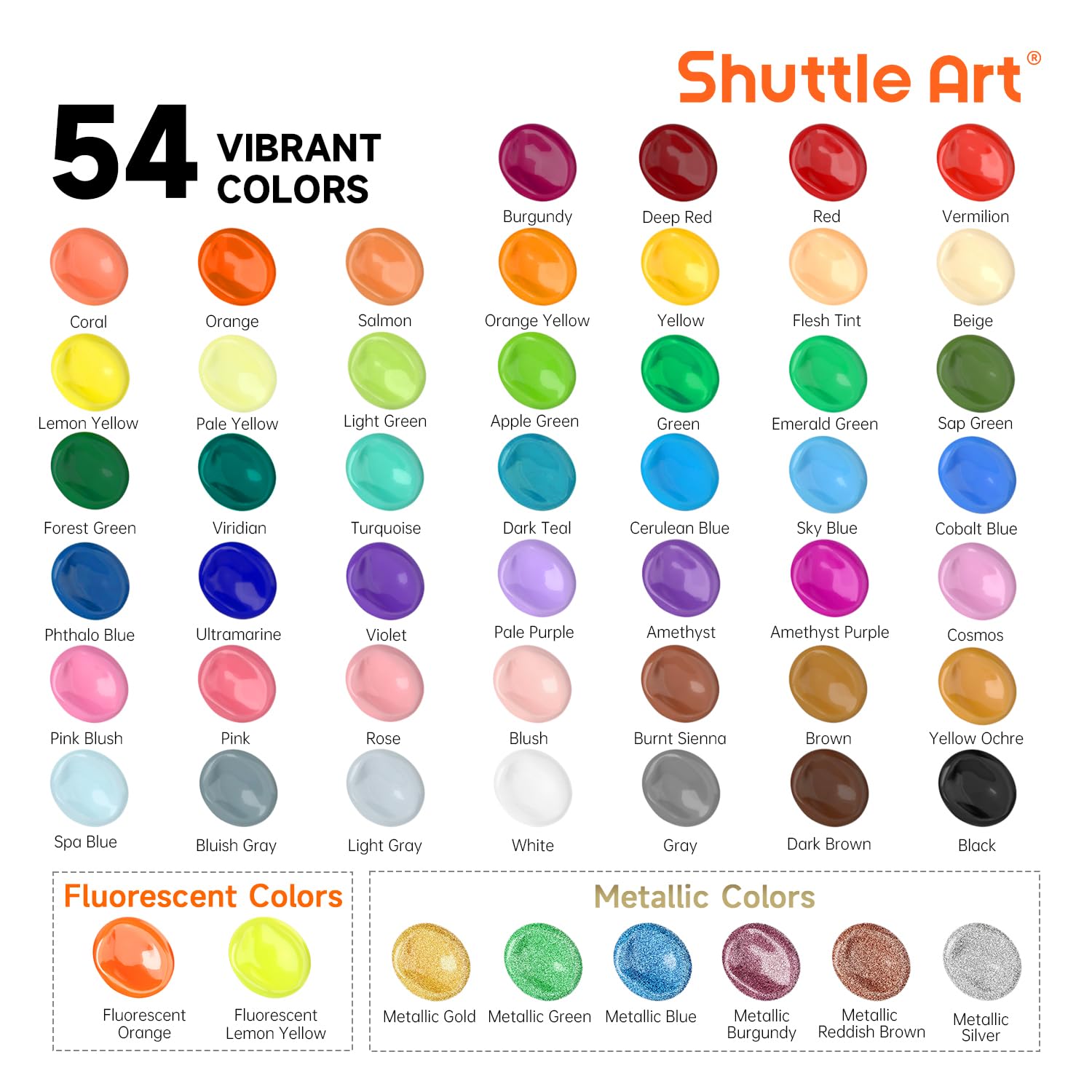 54 VIBRANT COLORS : Shuttle Art 66 pack acrylic paint set comes with 54 colors acrylic paint in 60 ml/2 oz bottles and 12 paint brushes, including the most commonly used colors and inspiring hot fluorescent and metallic colors to your art projects, ideal for painting and crafting