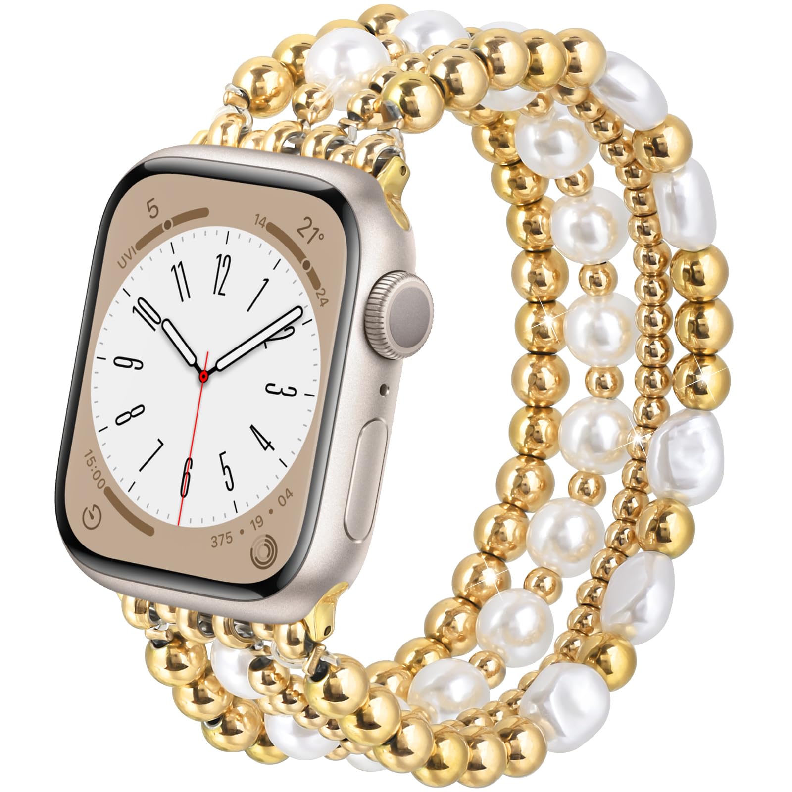 Gold Beaded Apple Watch Band: Made of premium quality stainless steel with 14K real gold plating that won't fade easily and can maintain its luster for a long time. Apple watch beaded bands for women contain 2 gold beaded bracelets and 2 pearl-beaded bracelets. It's very comfortable to wear. It is an excellent choice for people with susceptible skin.
