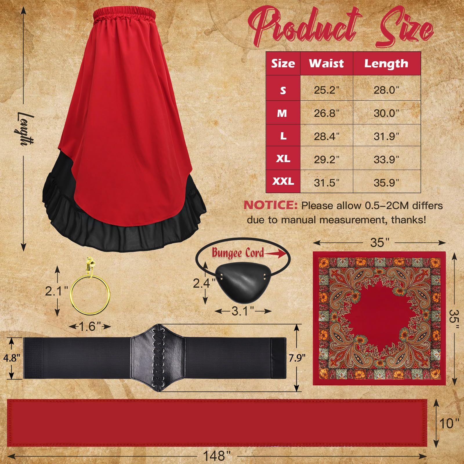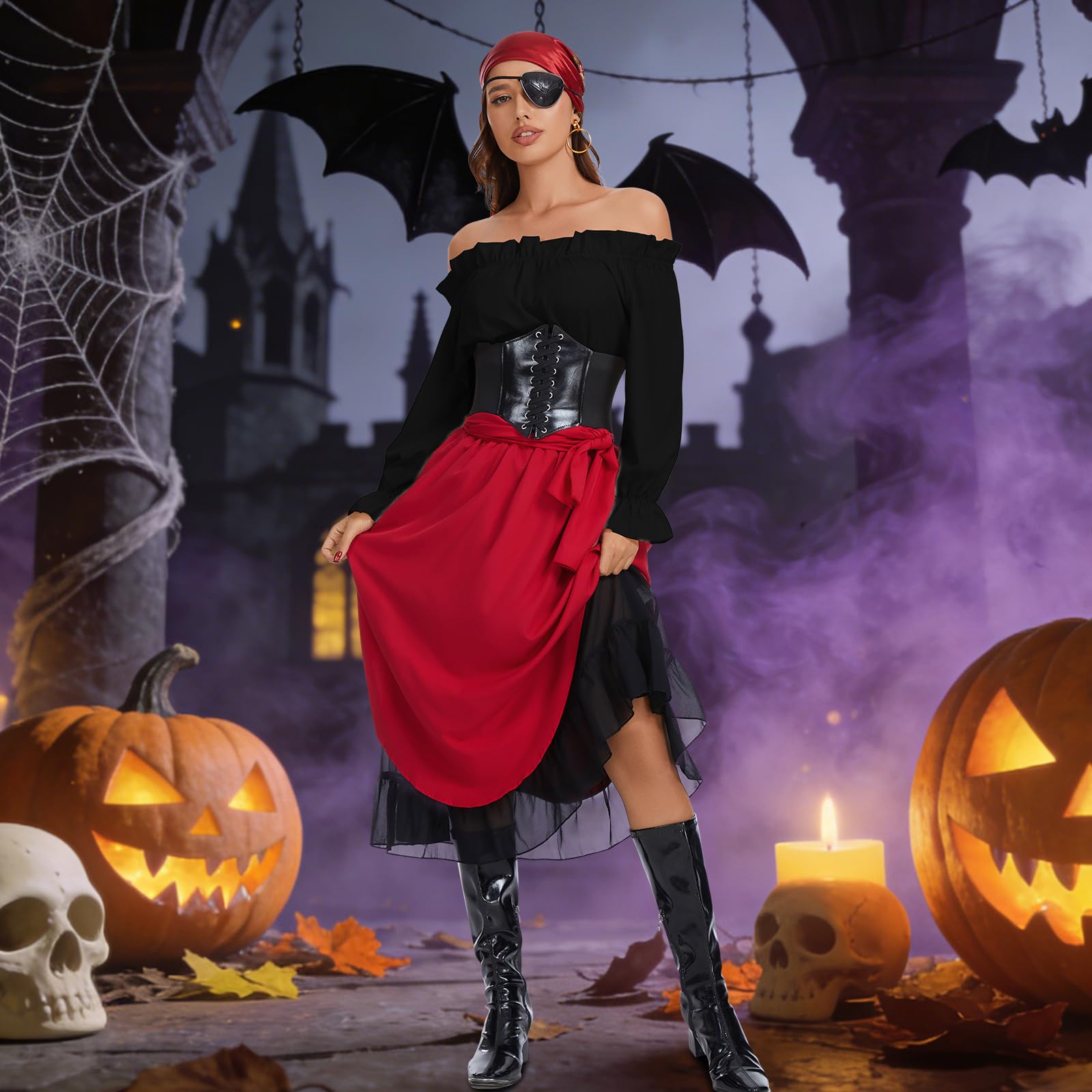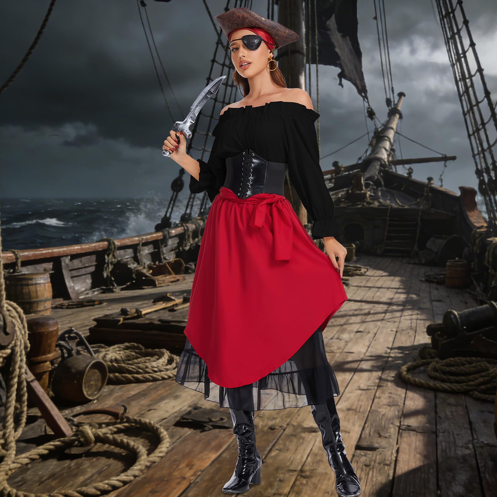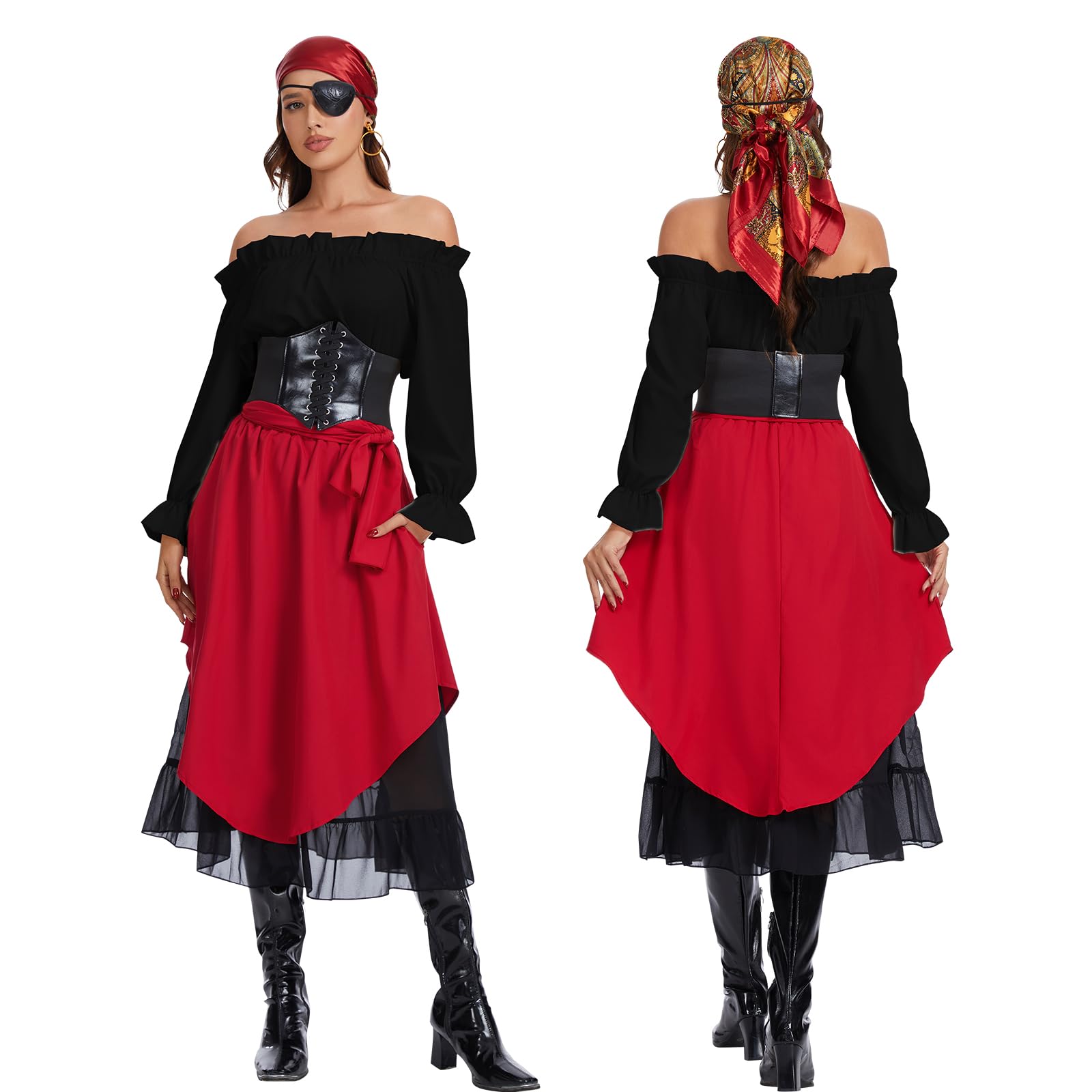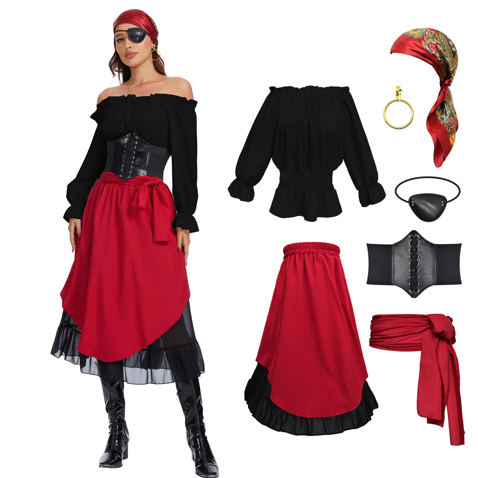 Women's Pirate Costume Set:1 x Renaissance Top, 1 x Pirate Skirt, 1 x Corset Belt, 1 x Pirate Bandana, 1 x Pirate Sash, 1 x Eyepatch, 1 x Earring for your party or cosplay needs.