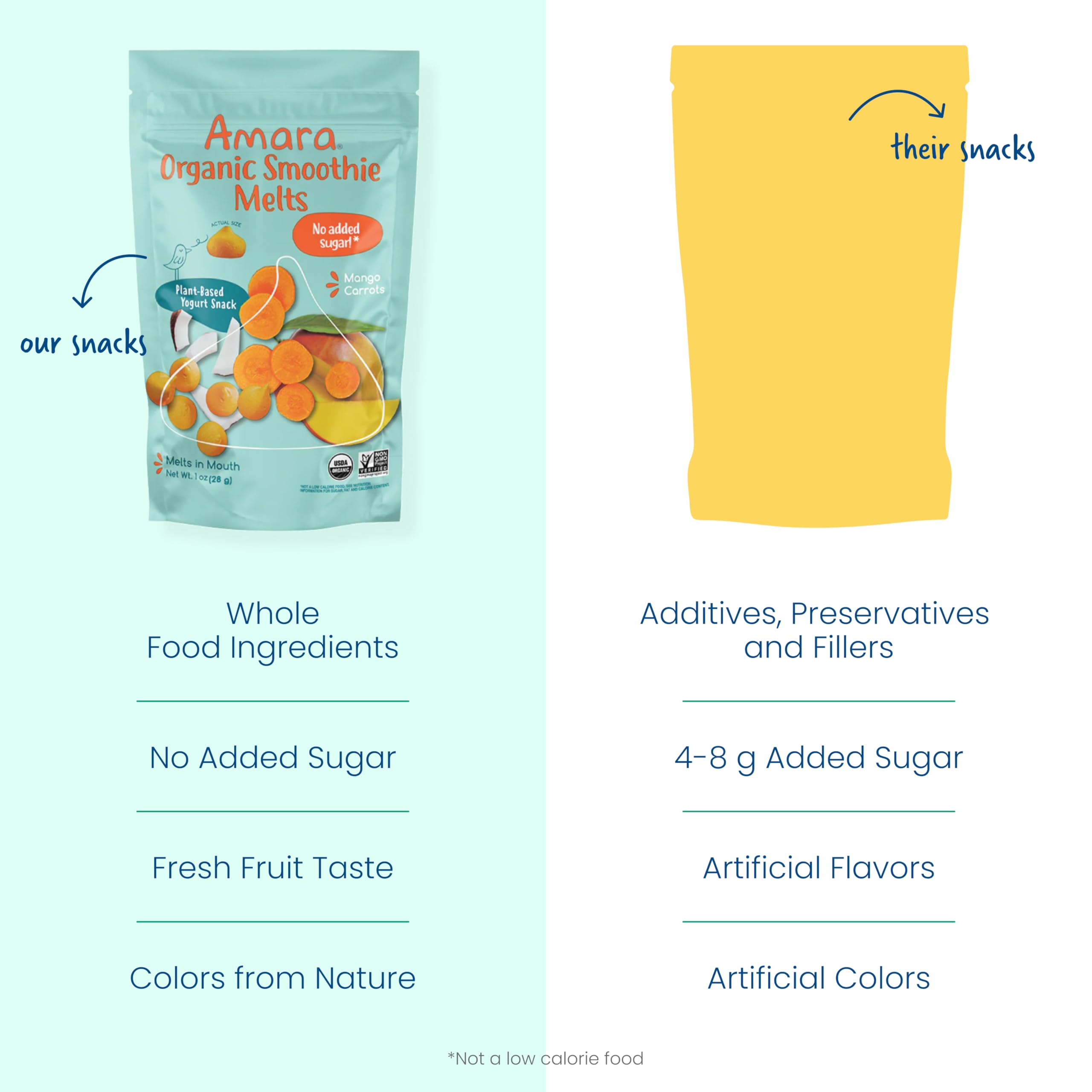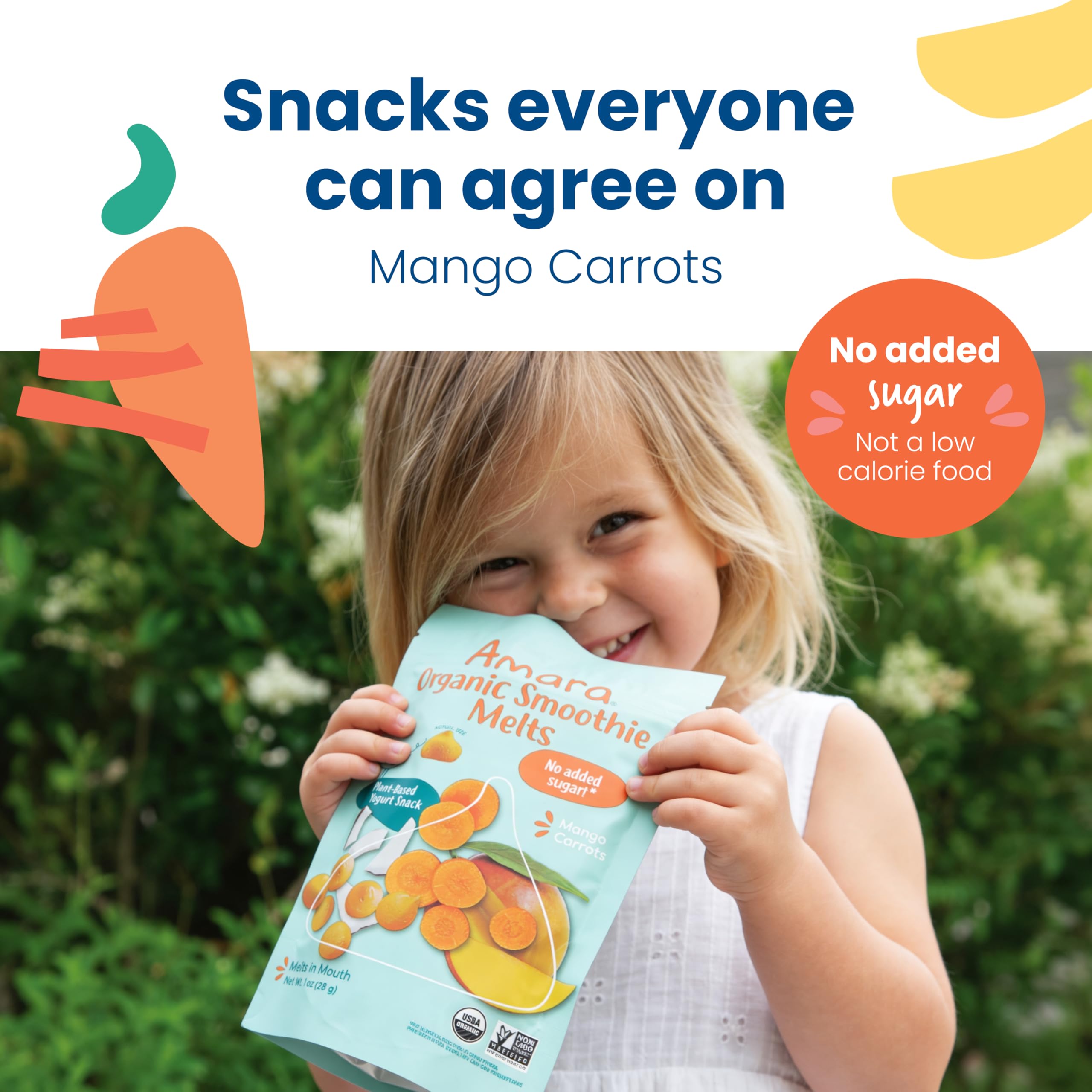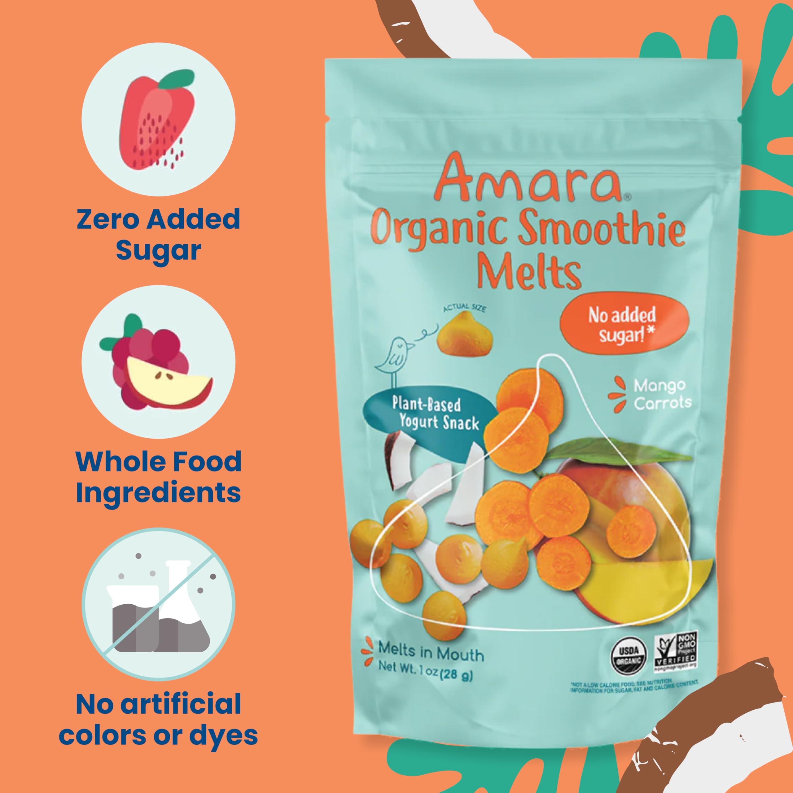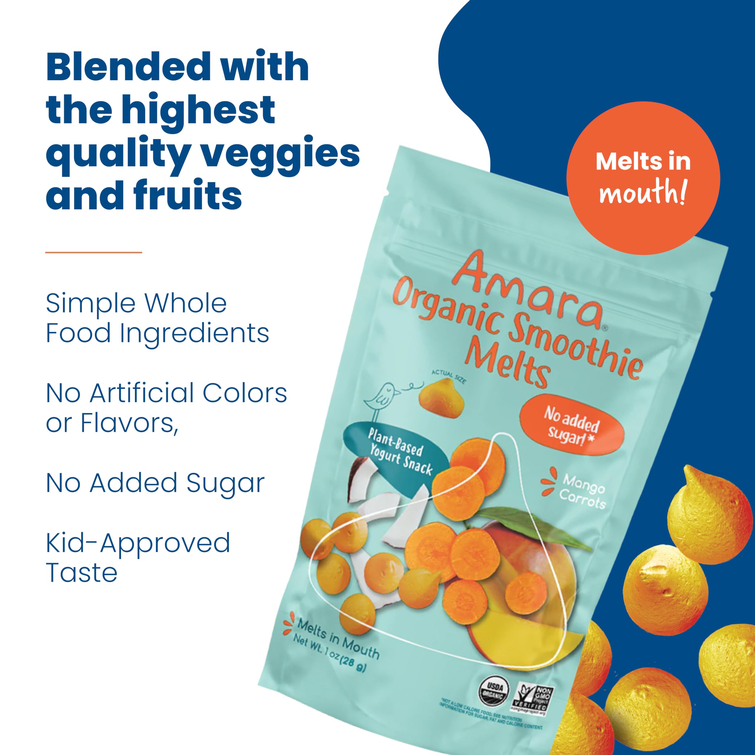 NO ADDED SUGAR: Amara delivers nutritious baby food and snacks that are 100% organic and non-GMO. The first melt-in-mouth snack without any added sugar or fillers, these melts keep little hands busy and tiny tummies full without the sugar crash.