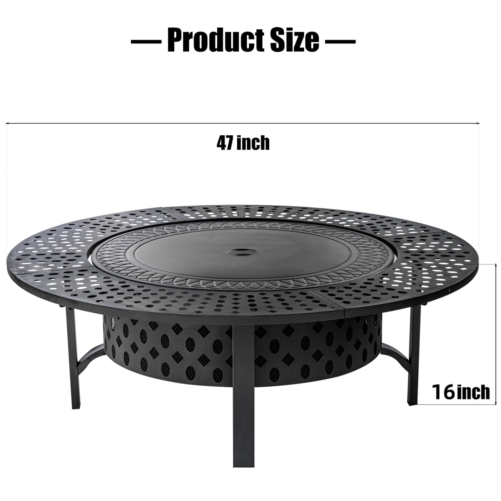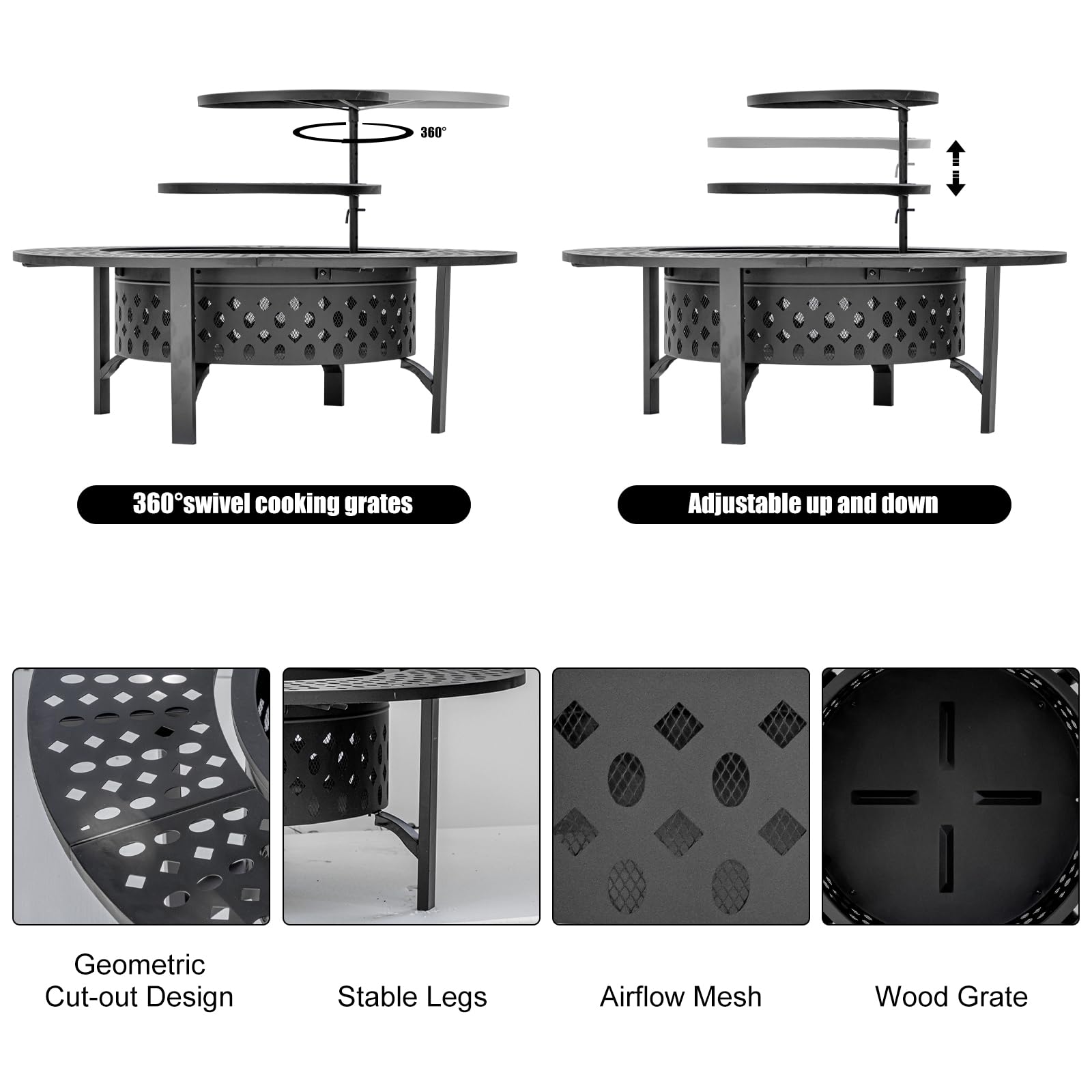 [Beautiful & Humanized Design]OutVue fire pit table comes with 2 height-adjustable and 360° swivel grills which disassemble freely. You can barbecue, keep food warm or put pan to cook on them. The side of wood-burning fire pit is created with modern geometric cut-out design which catches firelight for creating fun shadows. The drilled design promotes airflow and keeps the fire strong. All sophisticated designs of the fire pits for outside are dedicated to the warmth and comfort for you.