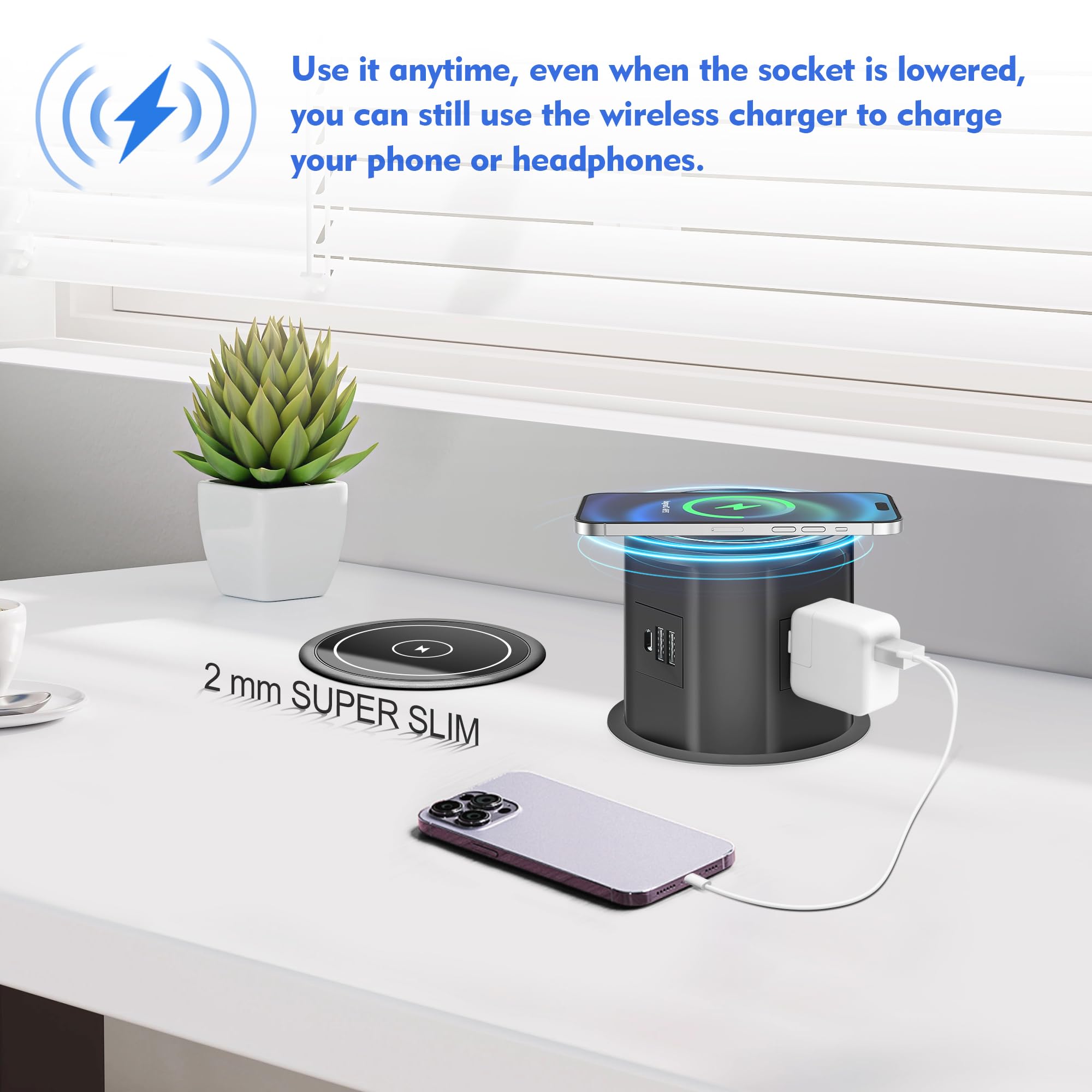 Save space: pop up outlet is hidden by a pneumatic structure that automatically raises with a simple press. When lowered, it can be used to charge your cell phone with a wireless charger while keeping your desktop tidier.