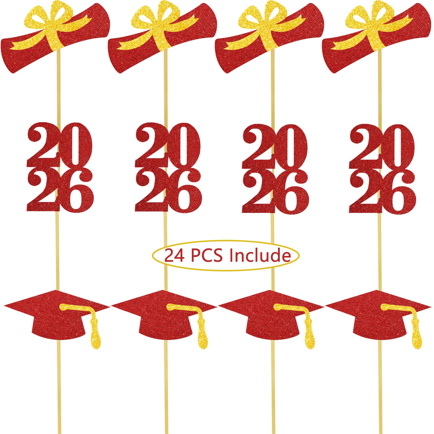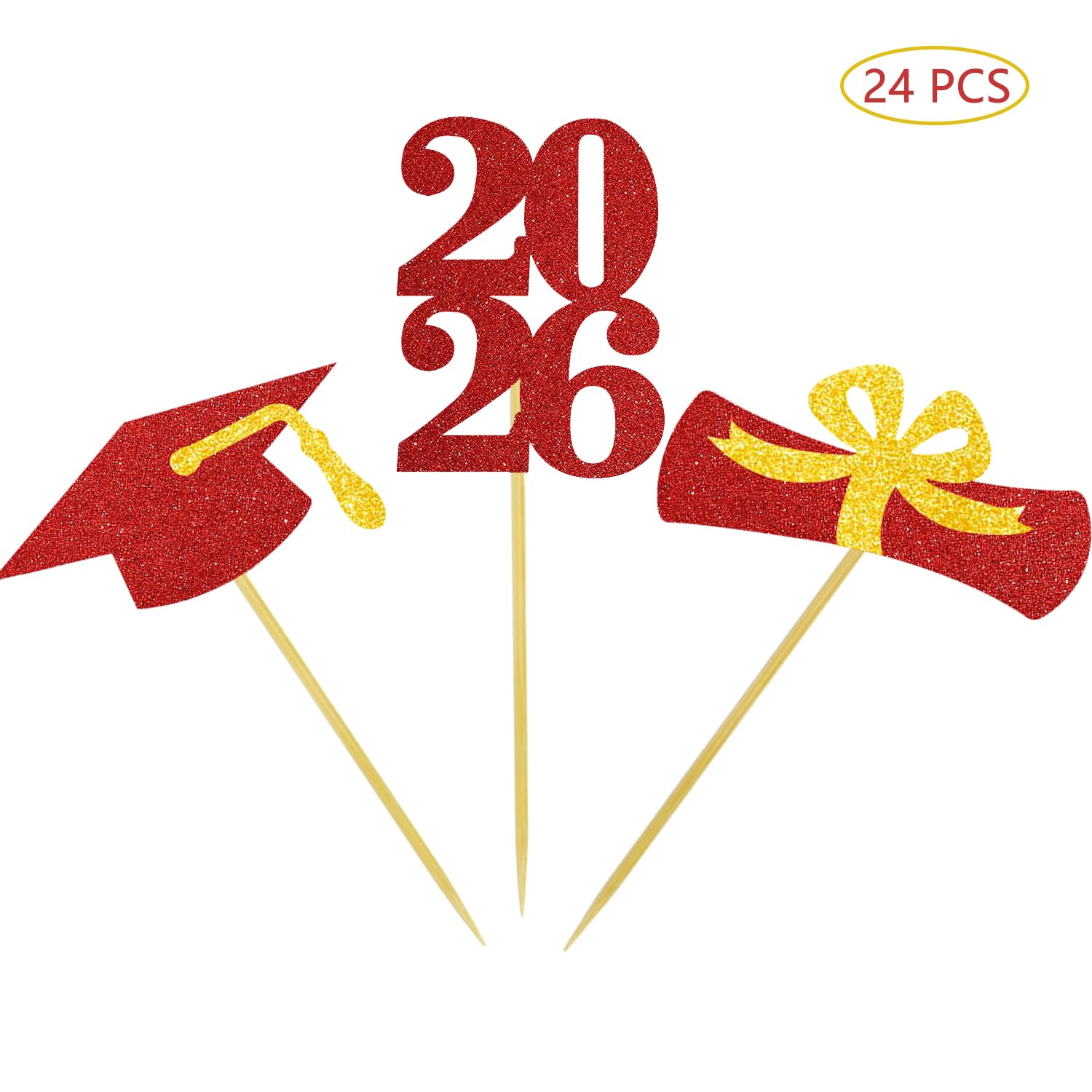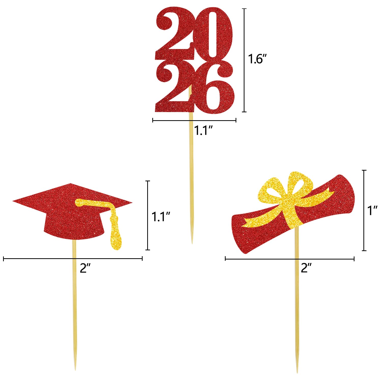 2026 graduation cap cupcake toppers: 8 pcs red grad cap cupcake toppers with gold tassel, 8 pcs red 2026 number cupcake toppers, 8 pcs red and gold diploma bow cupcake toppers