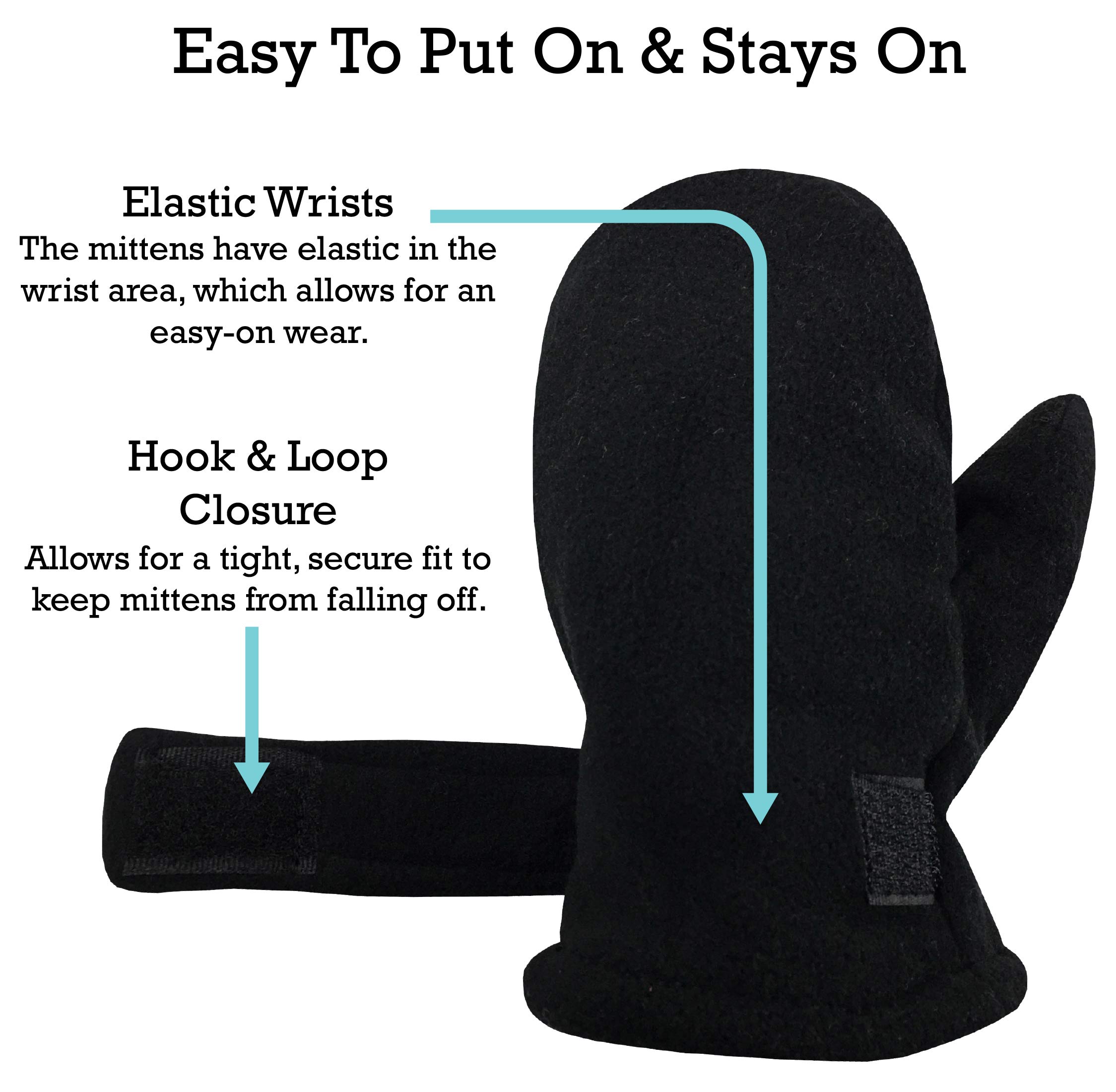 BABY & TODDLER GLOVES THAT ARE EASY TO PUT ON: The infant and toddler mittens are designed with elastic in the wrist area, which widens and allows for an easy-on fit on your children’s hands. The hook and loop closure allows for a tight, secure fit to keep the mittens from falling off baby and little kid’s hands. These are great for first-time mitten wearers and active little kids who love running around outdoors in the cold weather!