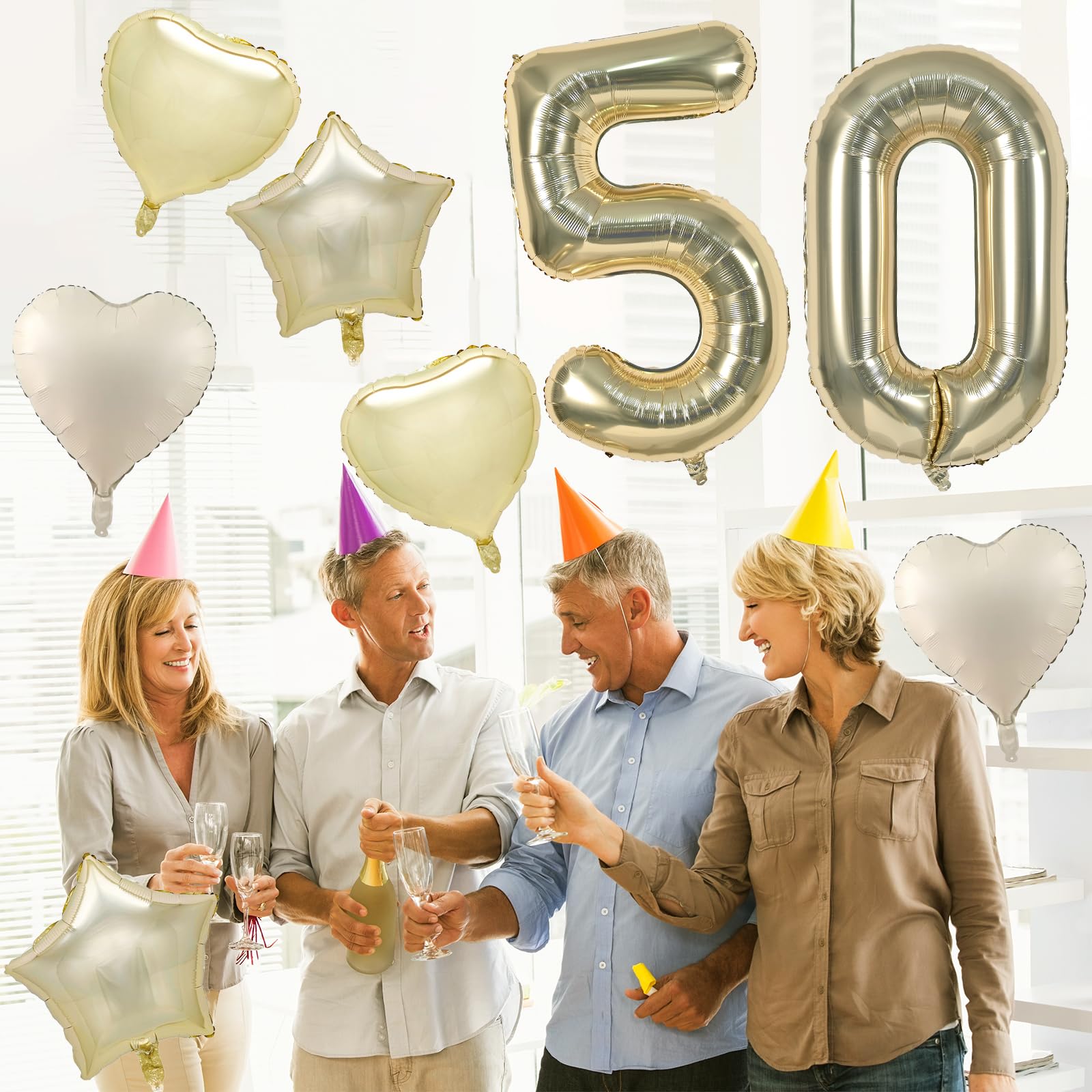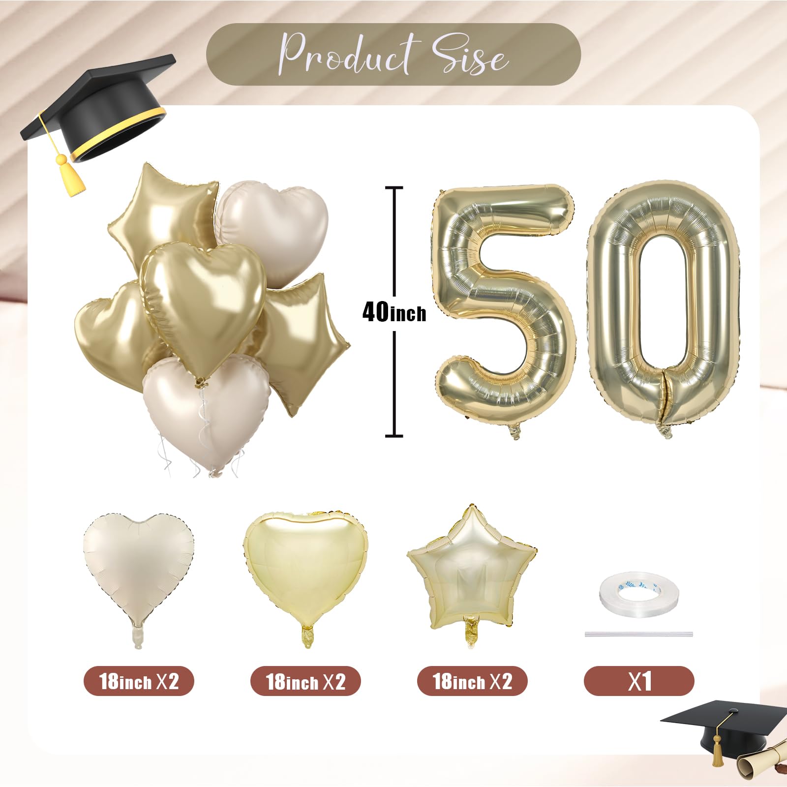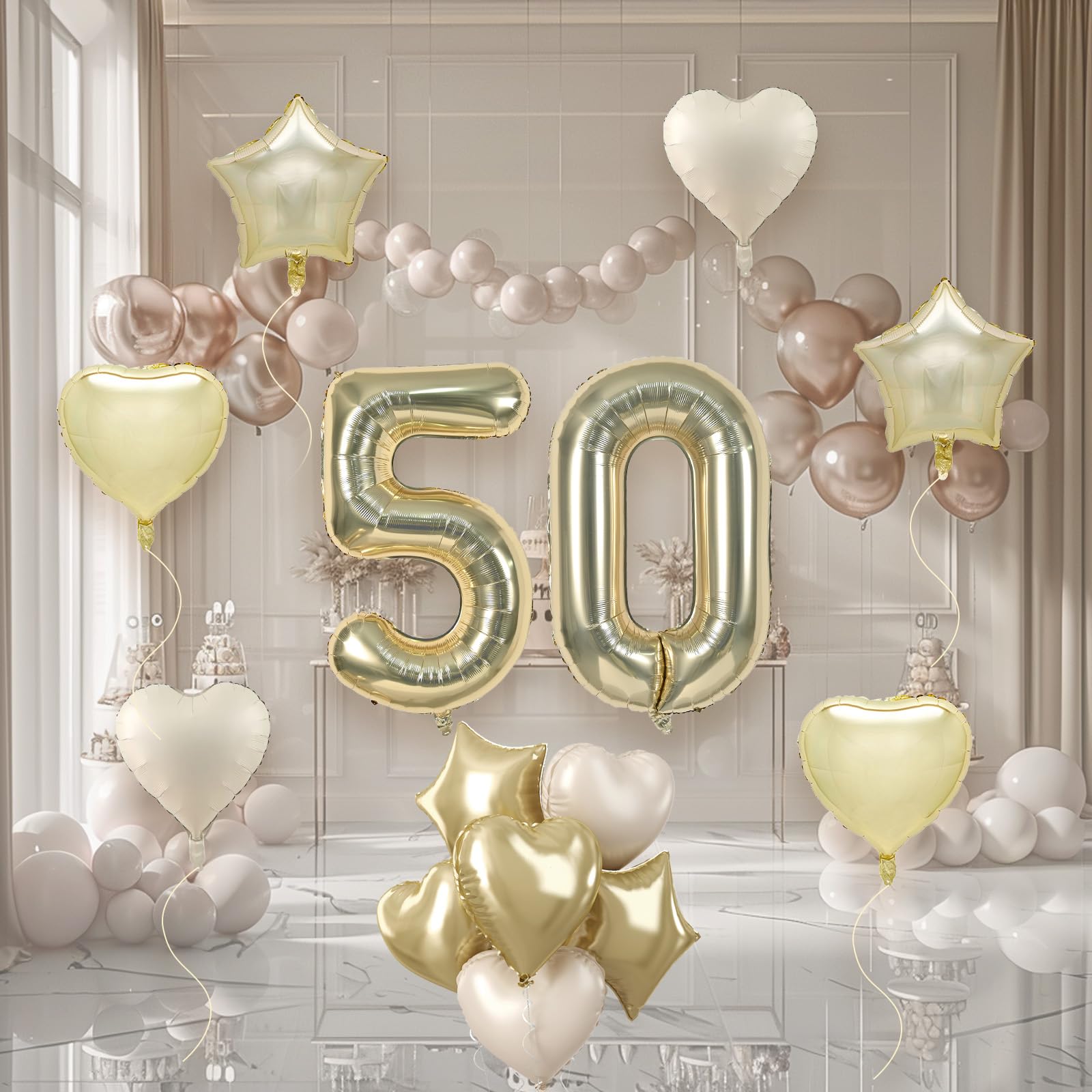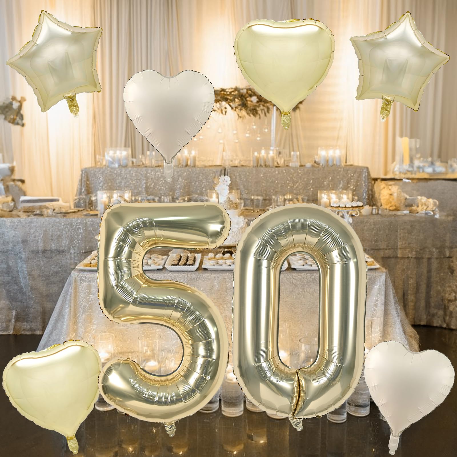 🎉 Champagne Gold Number 50 Balloon Set: Our foil balloons package include 40 inch light gold number 50 balloons (2pcs), 18 inch champagne gold heart balloons (2pcs), 18 inch cream heart balloons (2pcs), 18 inch light gold star balloons (2pcs), 10m ribbon(1 roll). With their colors and charming heart star shape, they can add love and joy to birthday party, weddings, anniversary and so on.