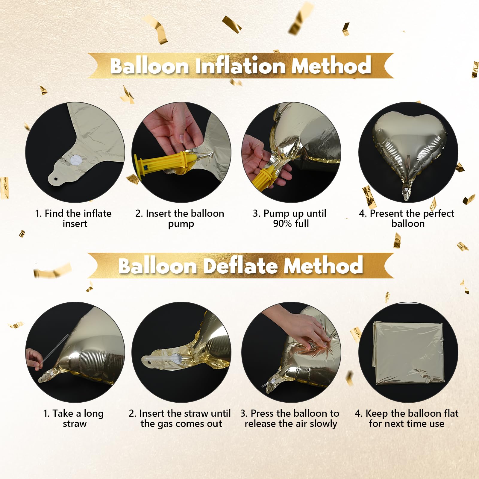 🎉 High Quality Materials: The light gold number 50 balloon, champagne gold five-pointed stars, beige heart balloons in the set are made of premium aluminum foil and adopt self-sealing design, not need to be knotted. Which is good texture, non-toxic, long-lasting performance, not easy to break. They can be easily filled with air or helium using the included straw, please press tightly the inflatable port after inflation.