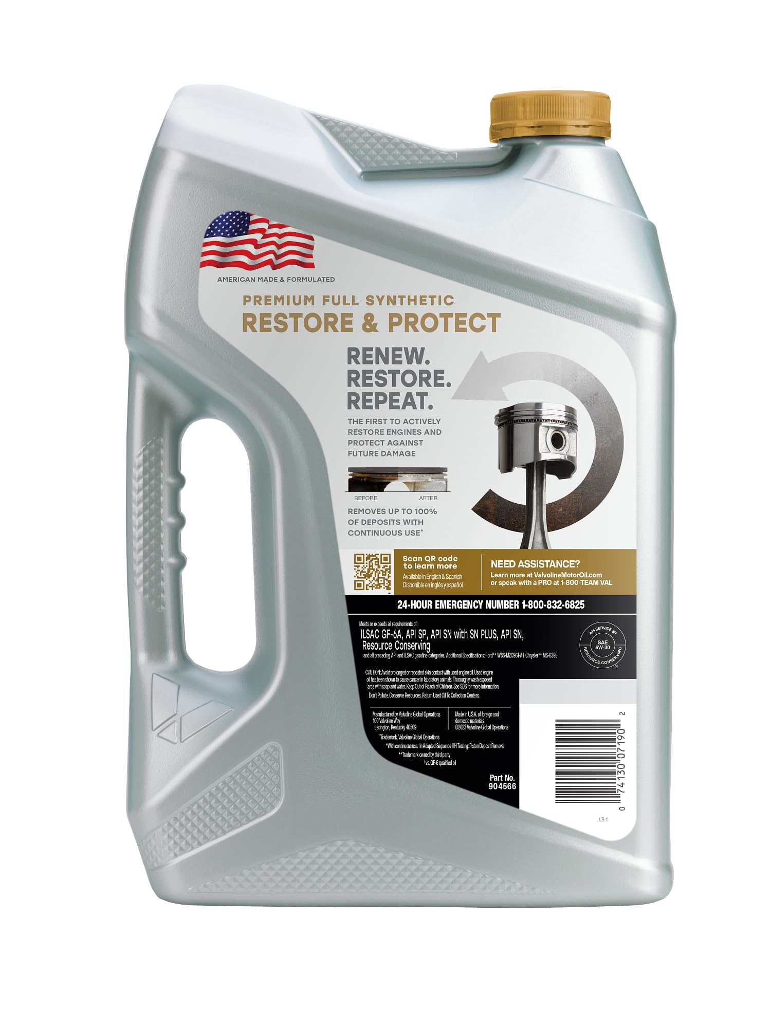 Restore & Protect Premium Full Synthetic is the biggest breakthrough in motor oil since Valvoline introduced it 150 years ago. With continuous use, Valvoline’s proprietary Active Clean technology removes up to 100% of deposits, while its exclusive Liqui-Shield technology works to prevent future deposit formation. A clean engine minimizes friction between metal surfaces, helping to improve fuel economy. Valvoline Restore & Protect is the best motor oil for any age vehicle, from a new car’s first oil change to high-mileage vehicles. There’s no other motor oil like it. Valvoline Restore and Protect Premium Full Synthetic helps maximize fuel economy, horsepower, and engine life. We made it first, so you can keep your pistons factory clean. Renew. Restore. Repeat. (*with regular oil changes. In Adapted Sequence IIIH Testing: Piston Deposit Removal) The best motor oil for any age vehicle, from your new car’s first oil change to high-mileage vehicles.