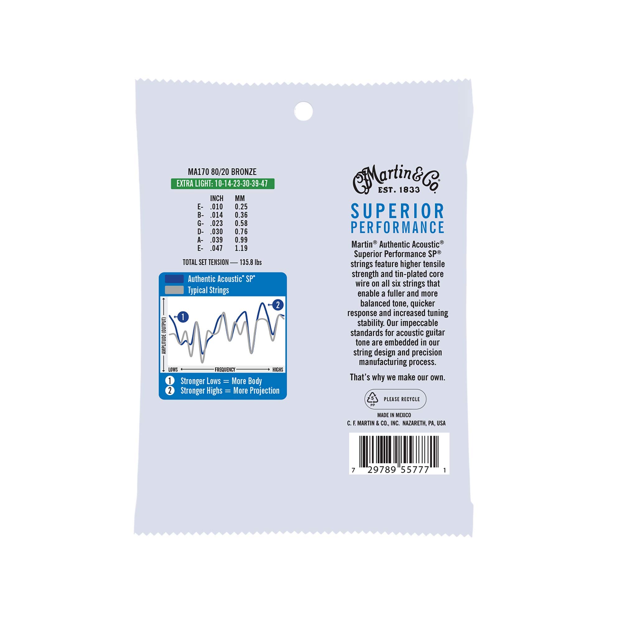 Martin Authentic Acoustic Strings provide unrivaled quality, craftsmanship, and tone for your acoustic guitar. Designed to produce a true, consistent tone, these extra-light-gauge strings provide excellent tuning stability and playability so your guitar can thrive during your rigorous practice and performance schedule. Made from 80/20 bronze, these strings feature Martin's highest-quality wrap wire for enhanced longevity and durability. They are naturally corrosion resistant, so they will hold up after hours and hours of playing. This total pack of professional-grade guitar strings will last through long jam sessions, late-night campfire songs, and plenty of picking. To make these strings extra-durable and stable, we start with our highest-tensile-strength core wire and then tin-plate it on all 6 strings for added corrosion resistance. When the core is coupled with our highest-quality wrap wire, you get a consistent tone that you can count on song after song. Designed to bring out your guitar's true tone, these bronze guitar strings can be used for finger-style blues, rock, Americana, country, bluegrass, ragtime, and many more styles. With this pack, you'll receive 6 extra-light-gauge guitar strings. The low E string measures 0.047", the A string measures 0.039", the D string measures 0.030", the G string measures 0.023", the B string measures 0.014", and the high E string measures 0.010". This total set of extra-light-gauge strings features a tension of 135.8, and they make it easy to get a rich, bright tone out of your guitar. Martin Guitar has been producing high-quality, musician-choice guitars and guitar accessories since 1833. The 3-pack Martin Authentic Acoustic Extra-Light-Gauge Guitar Strings are the real deal—not an imitation. Discover your guitar's true voice with this professional-grade guitar string pack.