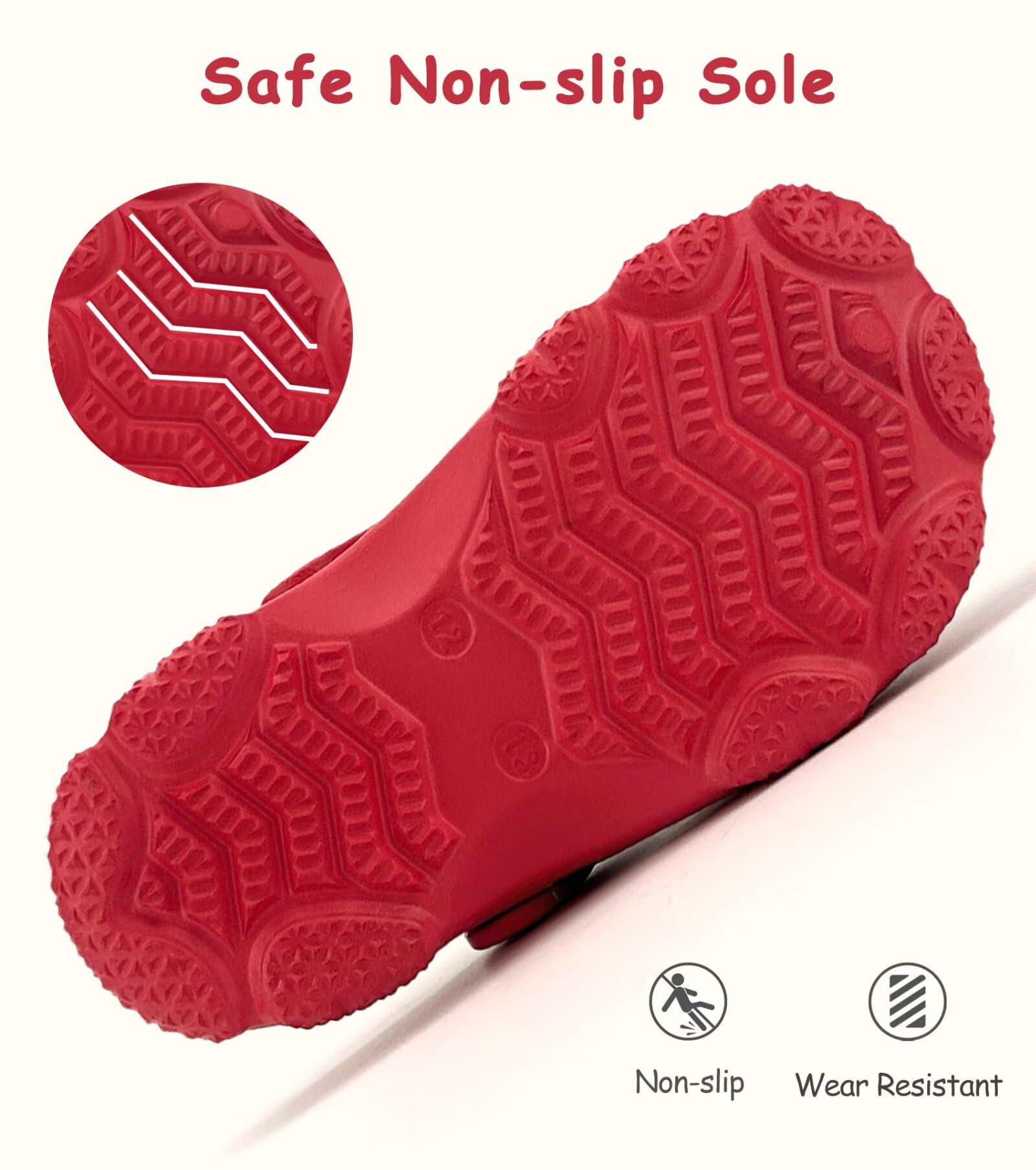 Non Slip Clogs: Non-slip sole texture and midsole non-slip particle design, allowing children to step on water confidently. Perfect for adventurous boys/girls exploring the world.