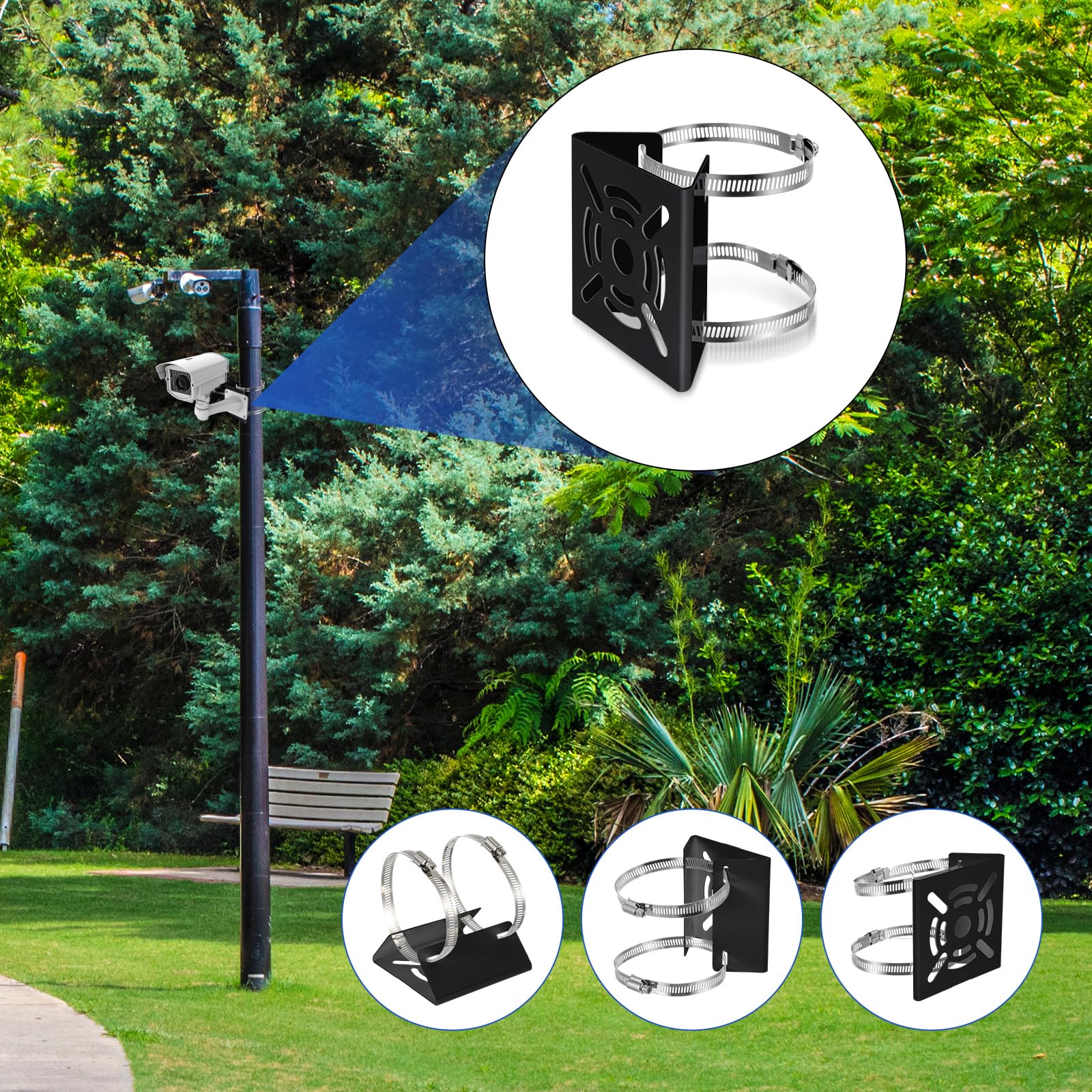 Features: With our security camera mount, you can easily adjust the camera's angle and orientation. Whether you need a bird's eye view or a ground level perspective, our product ensures you get the perfect angle every time. Our pole mounting brackets are suitable for both smooth round and hexagonal posts, and they can be firmly fixed thanks to the screw lock design. If you need to remove the camera for repairs or adjustments, simply loosen the screws with no additional hassle. Specifications: Material: steel Color: black Size: Brackets: about 4.64 x 4.37 x 2.12 inches/ 118 x 111 x 54 mm Loop: 0-3.9 inch/ 0-100 mm Package includes: 3 x Pole mounting brackets 6 x Loops Notes: Manual measurement, please allow slight errors on size. The color may exist a slight difference due to different screen displays.