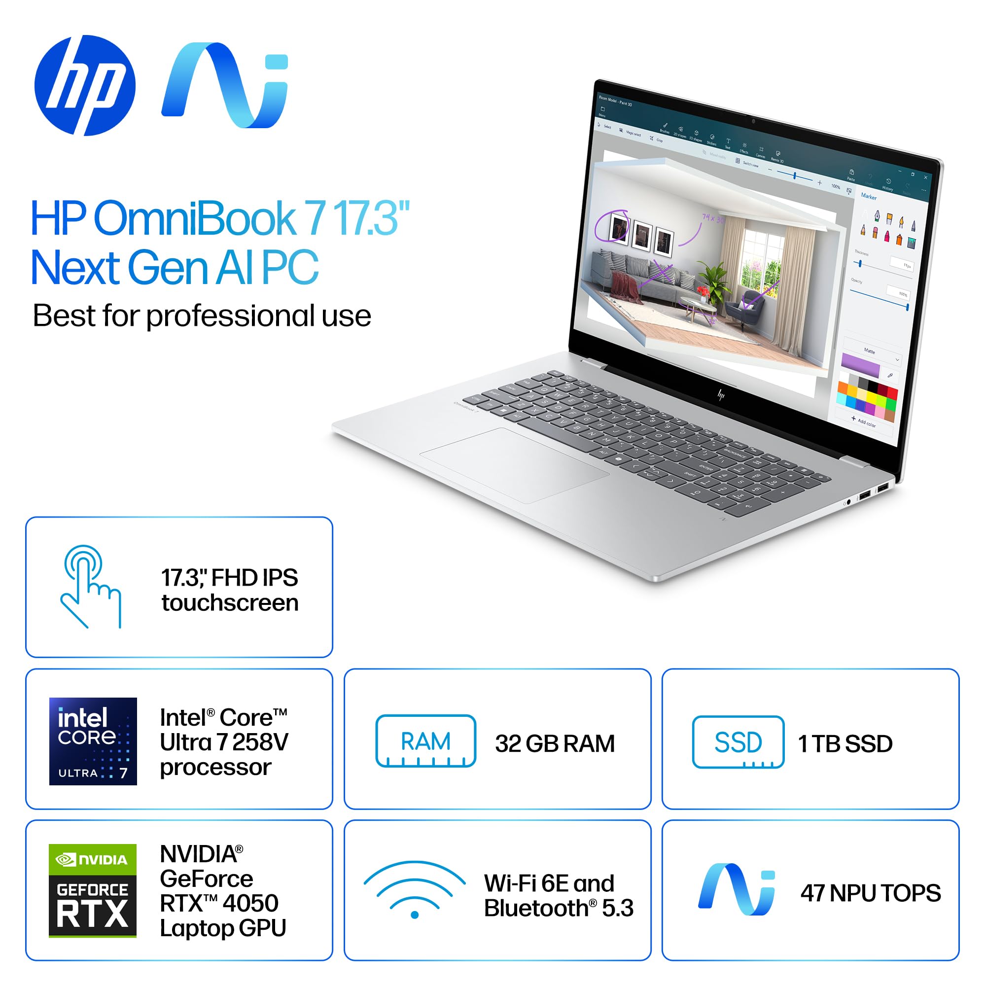 [Feature]: Slim, sleek, thin, durable silver HP OmniBook 7 17.3" AI Laptop | Intel Evo Platform Powered by Intel Core Ultra 7 258V (8-Core), Built-in NPU (47 TOPS) | Windows 11 Copilot+ PC: Boost Creativity & Productivity with AI Assistance | MILITARY-TESTED DURABILITY - Passing US military-grade testing and up to 25,000 HP Total Test Process hours | 5MP Camera: Enhanced by AI Noise Reduction & Poly Studio Audio Tuning | Backlit Keyboard | Poly Camera Pro with updated A features | Boost battery life andenhance security.
