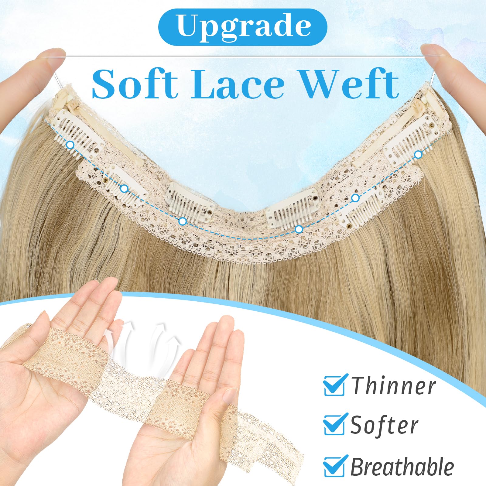 【Get Layered Hair In Seconds】 Invisible wire hair extensions is the easiest and quickest tool for adding volume and length. Anyone can do it!KooKaStyle invisible wire hair extensions with new upgrade!Thinner&softer&Breathable double weft,lighter&fluffier Synthetic heat-resisting fiber,Make it perfectly blend with our hair and create a hair salon effect at home.