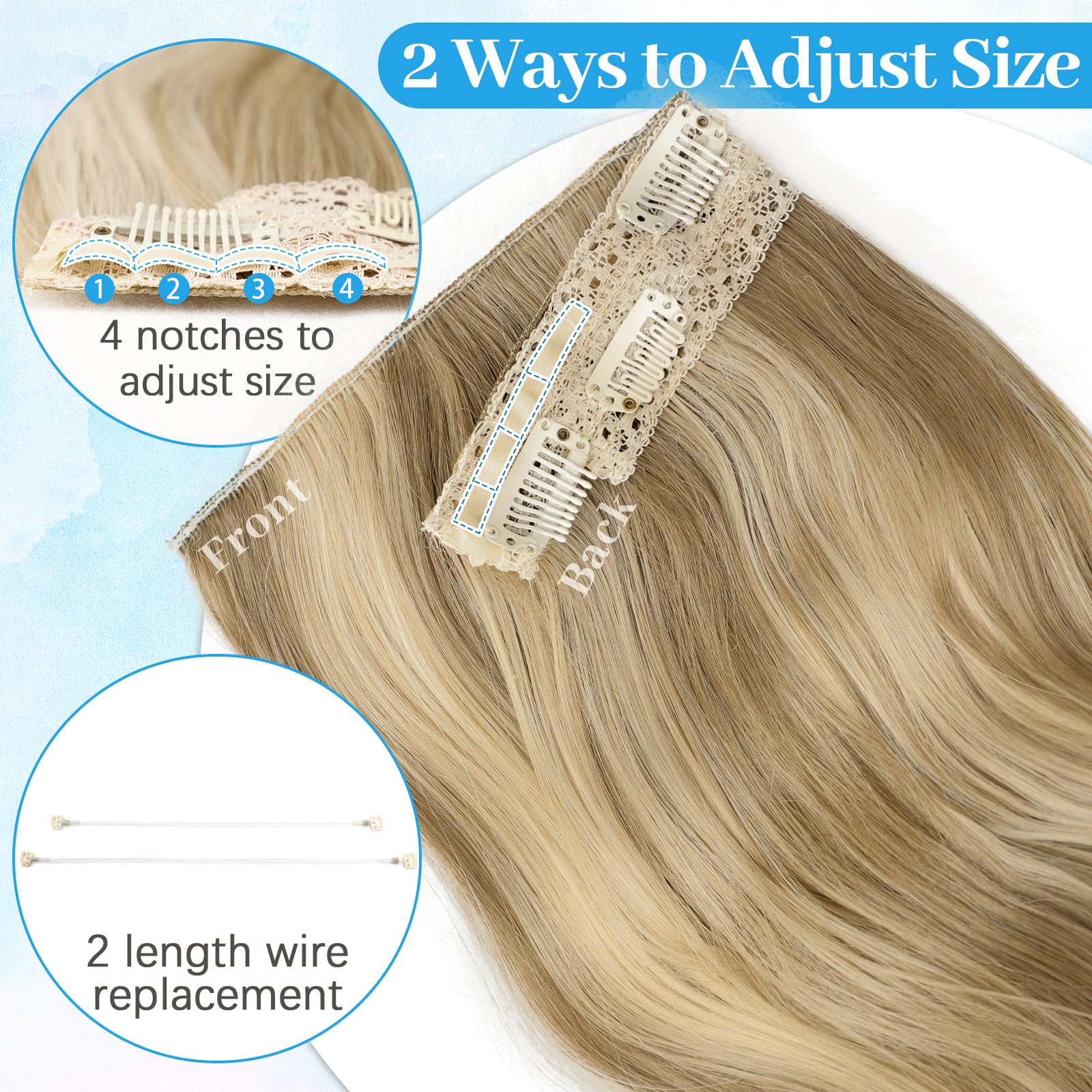 【Easy to Wear】Just 3 steps increase your hair volume quickly.Separate your hair above your ears, about 1-1.5 inches from your hairline, and leave it on top;Place the hooks in different positions to adjust the size to your head, then place the extensions with the wire in the back;Place 4 clips onto the hair for further security, then release the top of the hair;Finally, Use your own hair to hide the wire.