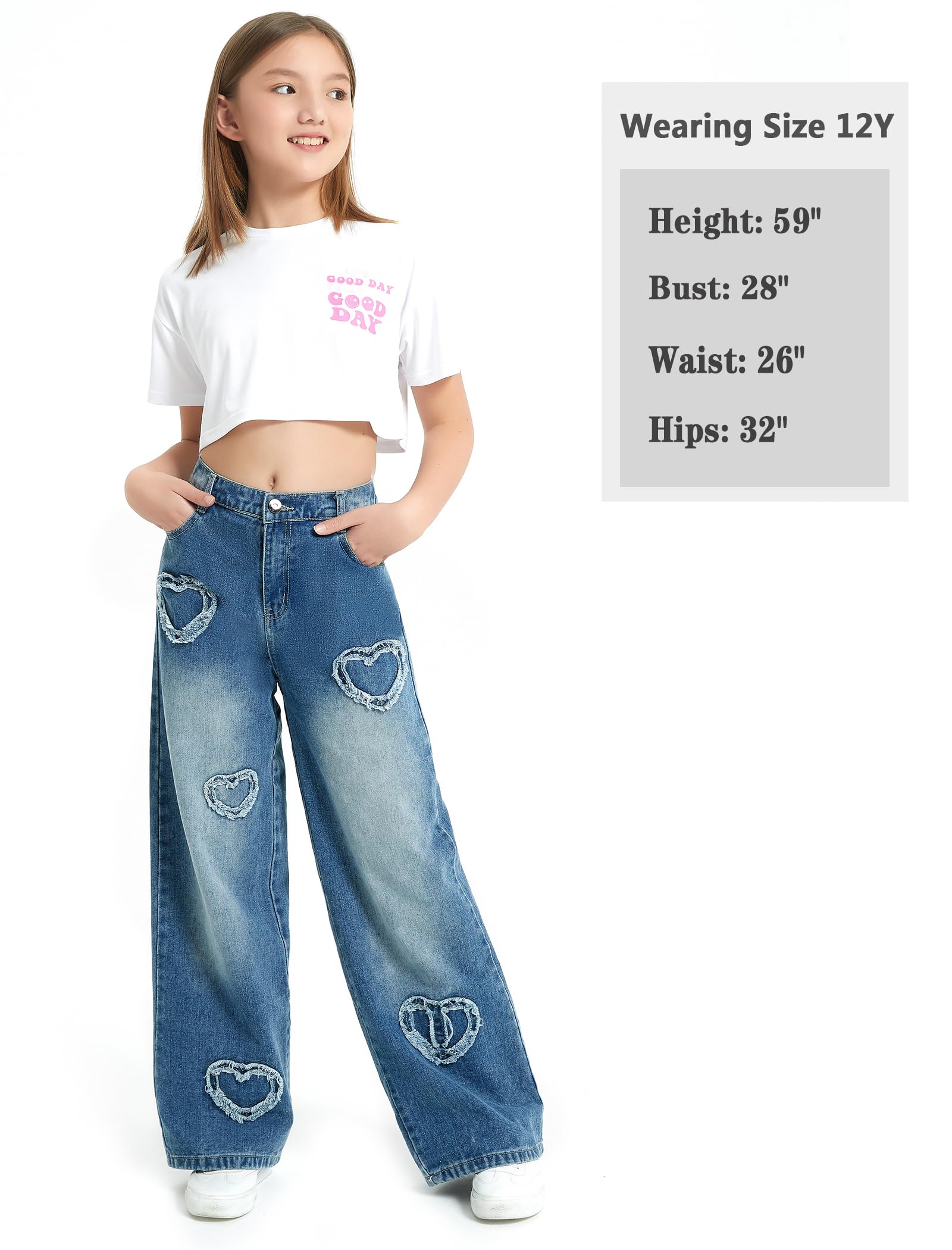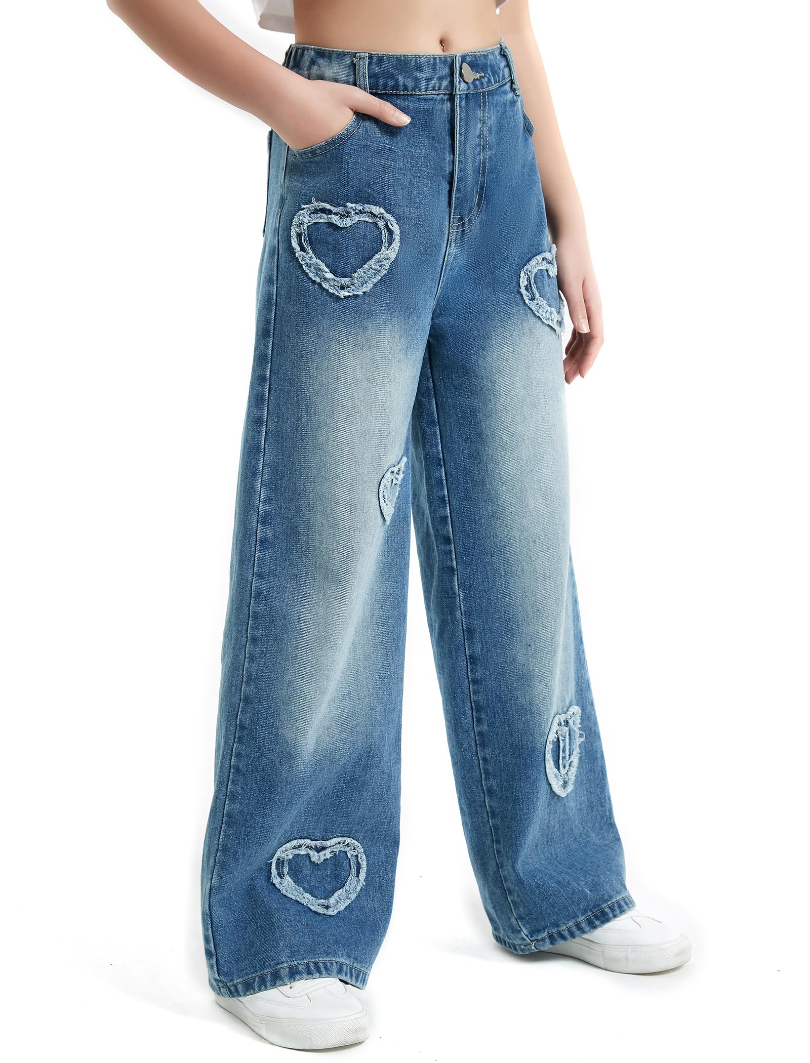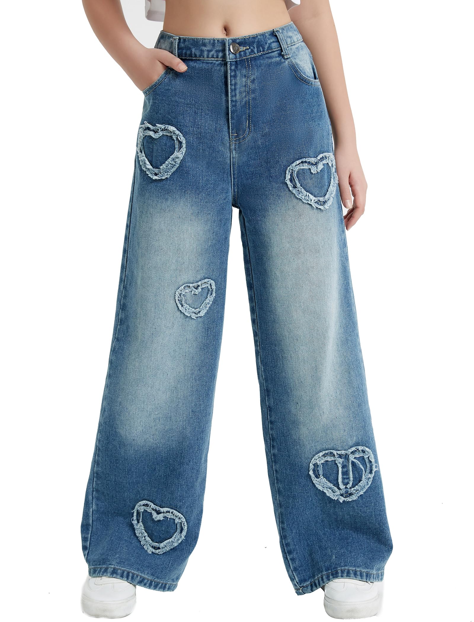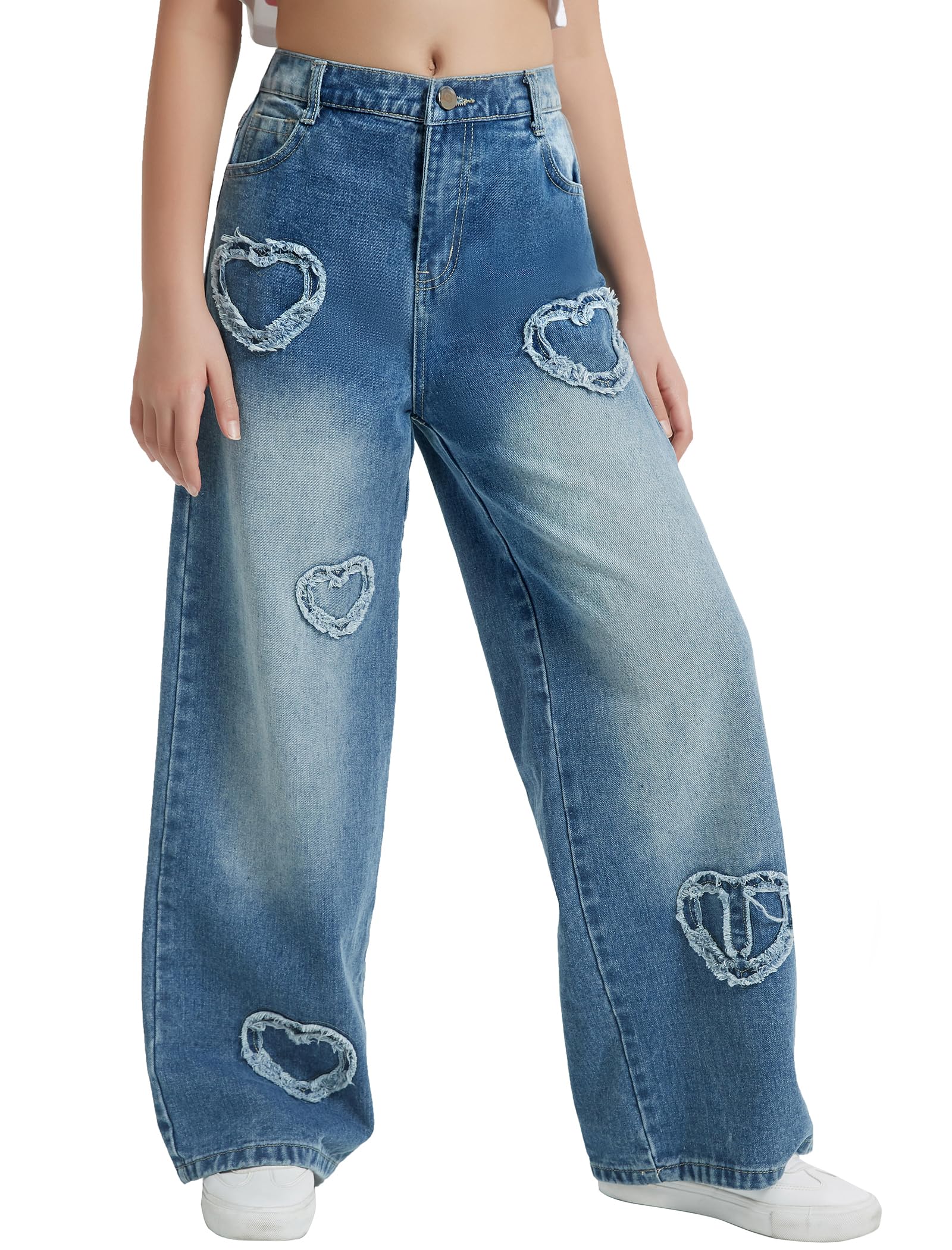Heart Patchwork Embroidery Jeans: These girls wide leg jeans feature a faded detail distressed design and elasticized waistband. High waisted wide fit with smooth silhouette. Ankle length shows off the curves of your legs