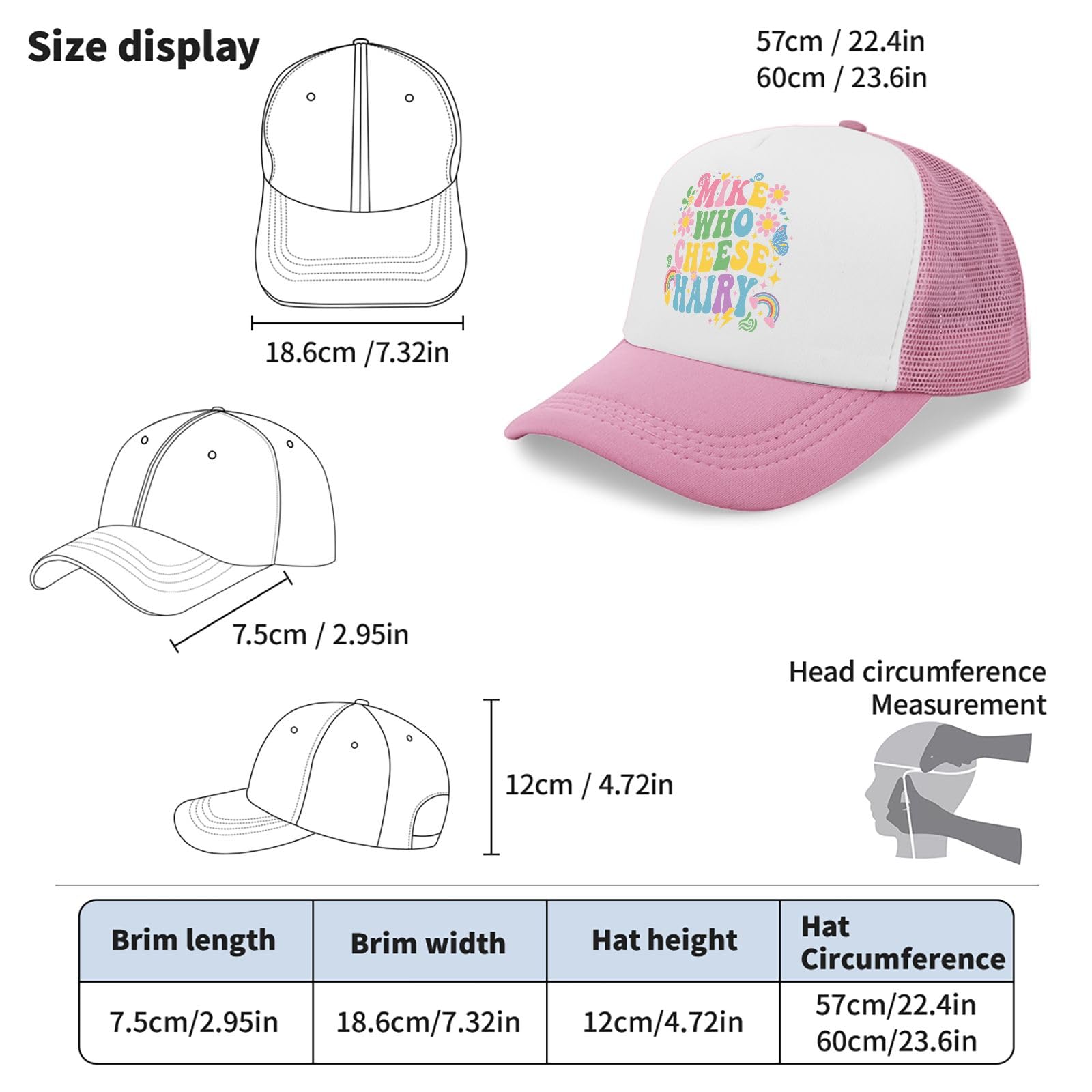 Description Stay cool and stylish with this charming trucker hat featuring an adorable elephant design against a vibrant rainbow background. The classic pink and white color combination offers versatility, while the mesh back panel provides excellent ventilation for breathable comfort on warm days. This baseball cap comes with thoughtful features including a built-in sweatband for moisture control and an adjustable buckle closure for the perfect fit. The structured design maintains its shape with a 7.32-inch brim width and 4.72-inch crown height, fitting head circumferences from 22.4 to 23.6 inches. The durable construction combines a solid front panel with breathable mesh backing, making it ideal for casual outings, sunny days, or adding a playful touch to your everyday wear. The whimsical elephant graphic with floral accents and rainbow stripes brings a cheerful element to this practical accessory, perfect for those who appreciate both function and fun in their headwear.