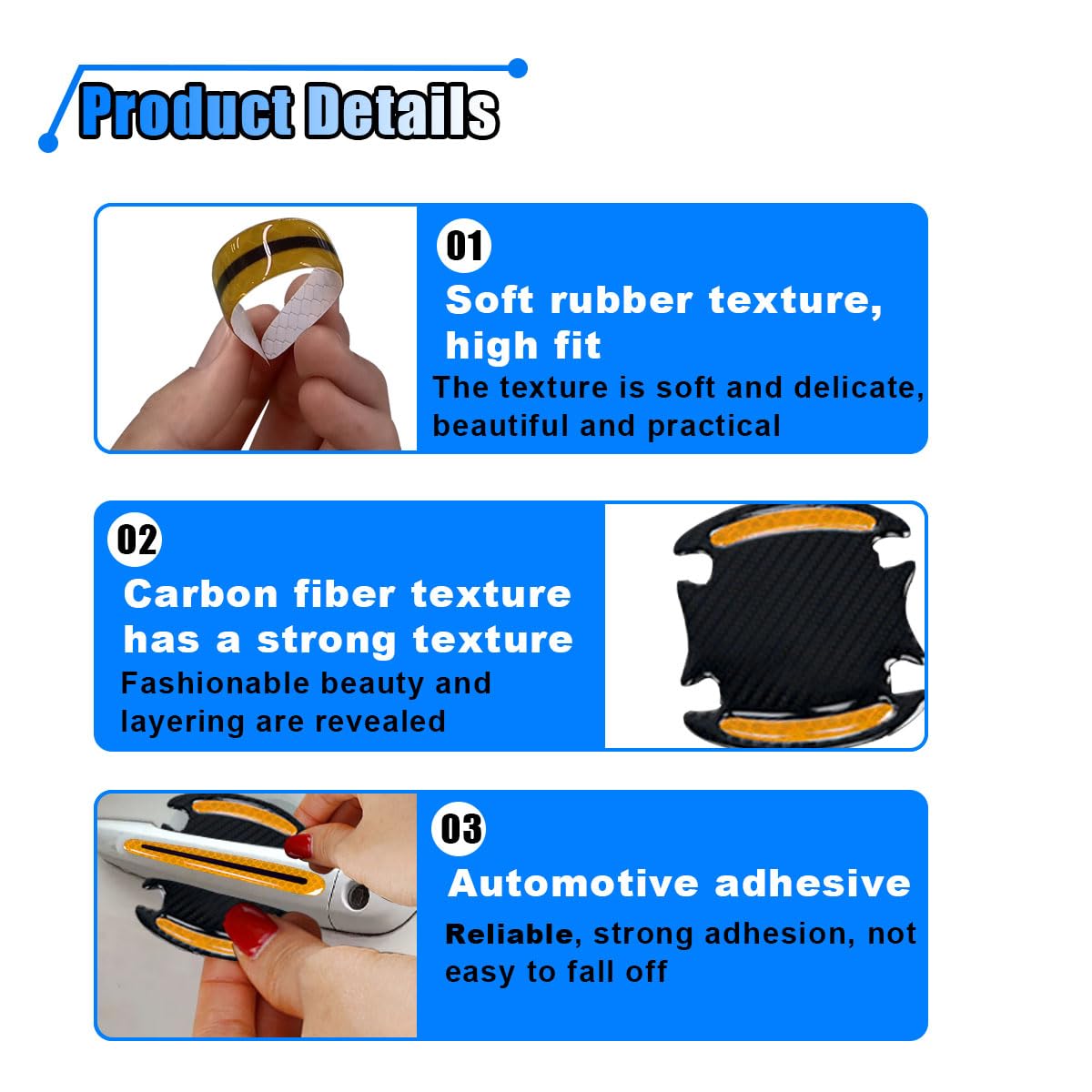 【High-Quality Material】:Door handle reflective adhesive with high-quality environmental protection PVC soft adhesive, strong and wear-resistant, not easy to fall off or deformation, waterproof and self-adhesive, easy to paste and remove, tear off no marks, will not damage your car paint, the surface of carbon fiber texture, full of modern.