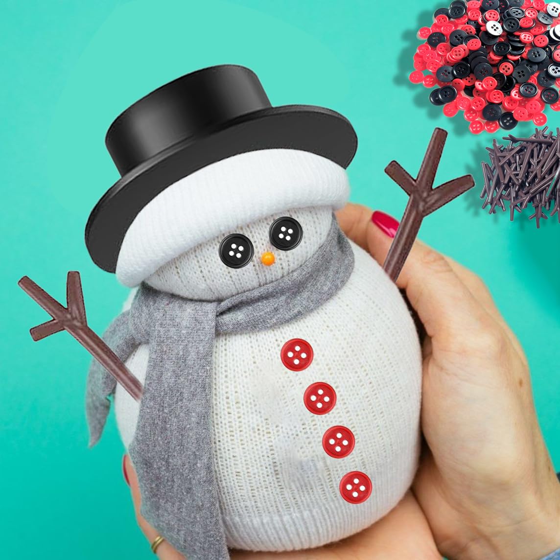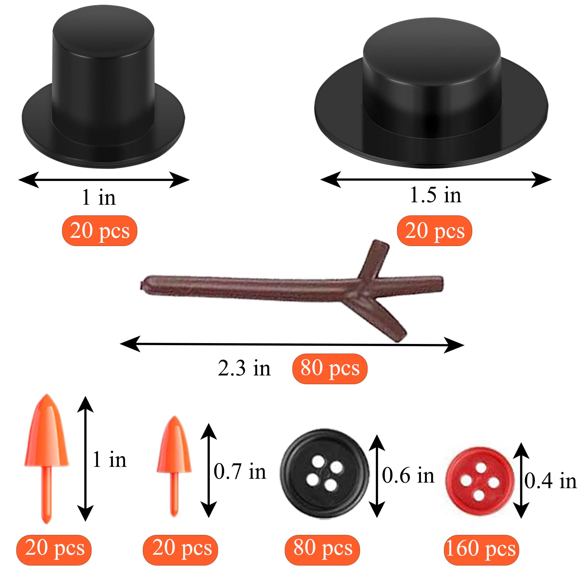 Package Includes – This set contains 40 orange carrot nose buttons in two sizes, 40 mini black top hats in two sizes, 80 brown trident hands, 80 black buttons, and 160 tiny red buttons.
