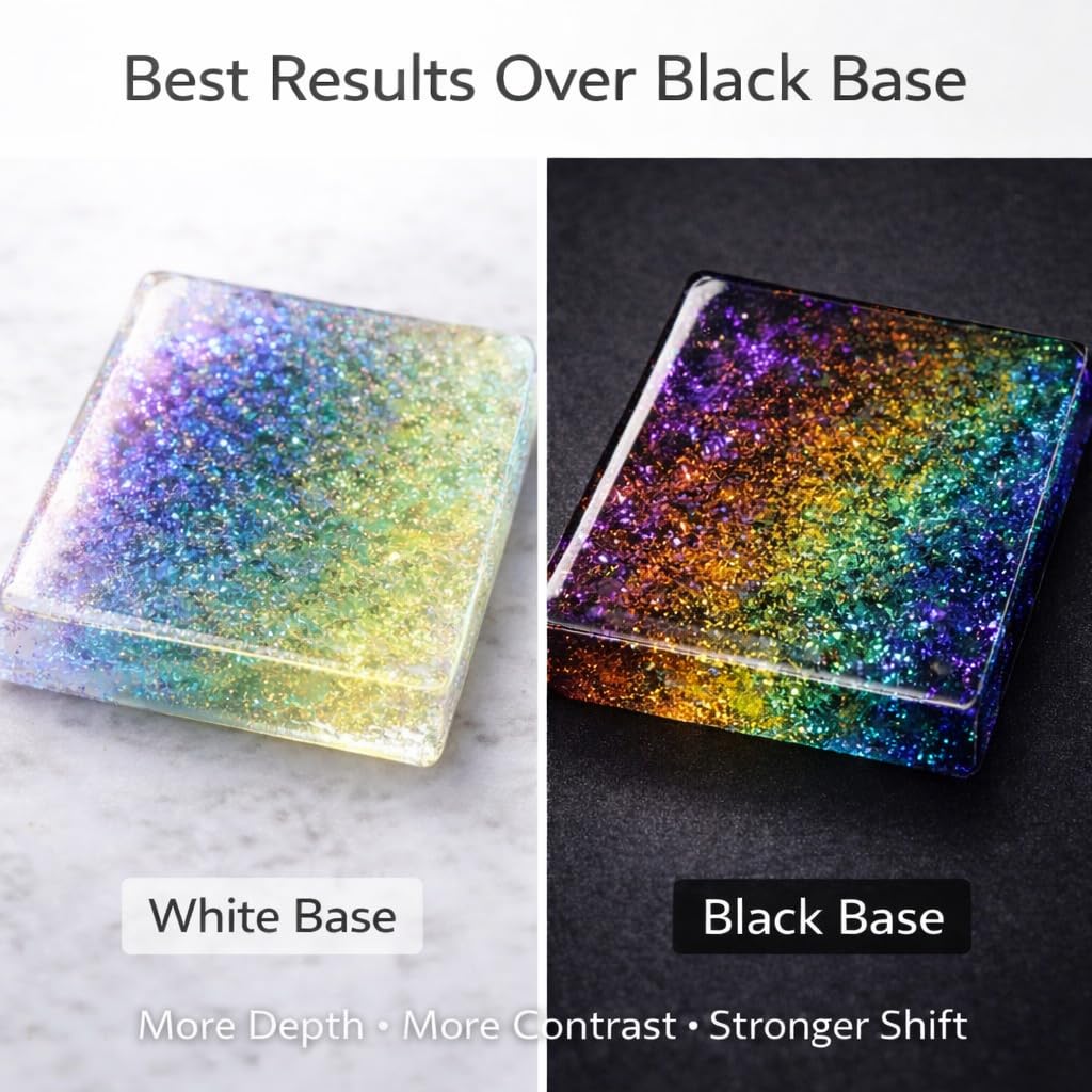 【 💙 HOLOGRAPHIC FLAKES EFFECT 】- Brush the molds with a thin layer with chameleon flakes for epoxy, otherwise, it will waste flakes and diminish the effect. To get the best color shifting effect, brush it on the resin molds and pour black resin. You'll need just a little to produce rich and vivid colors!