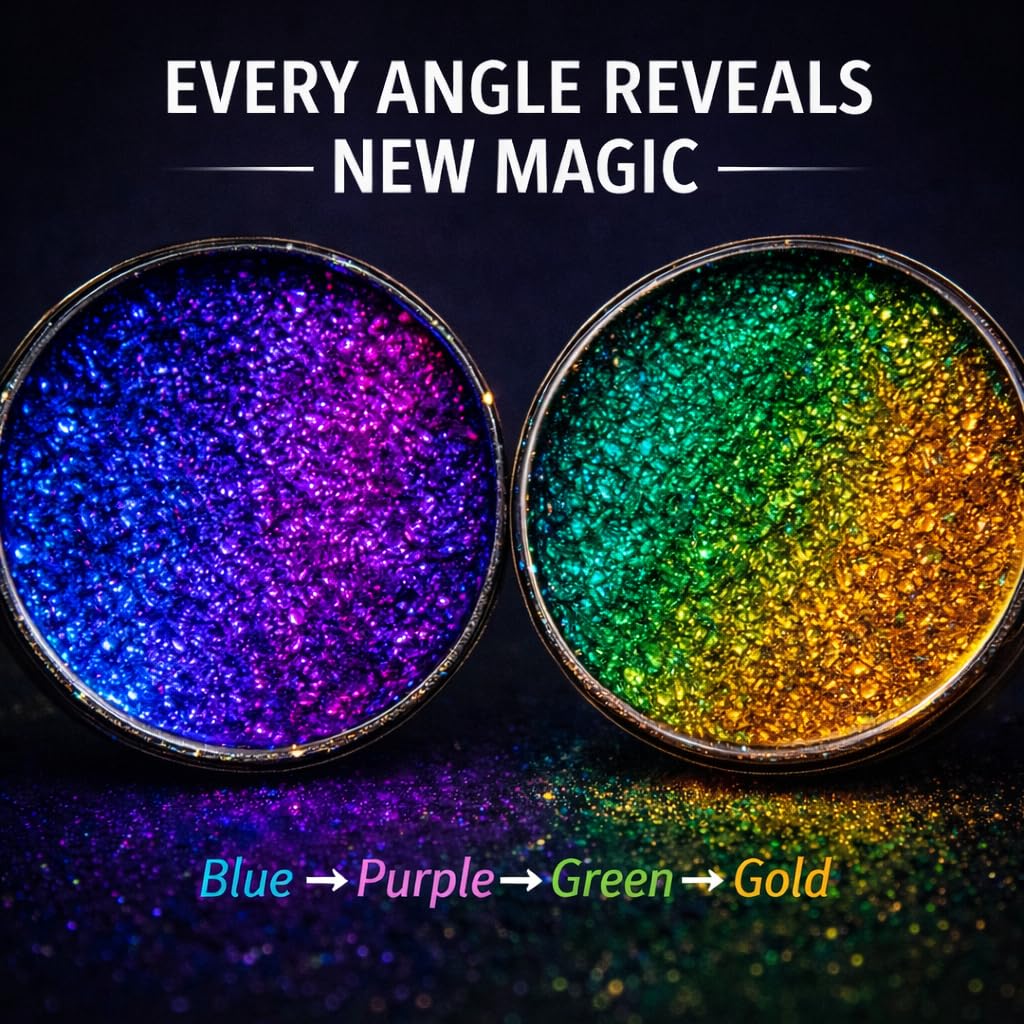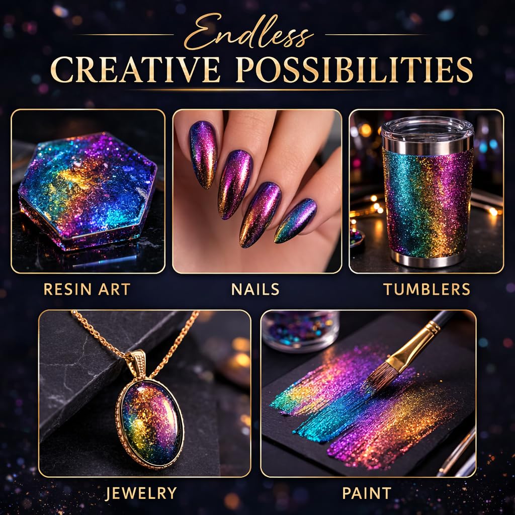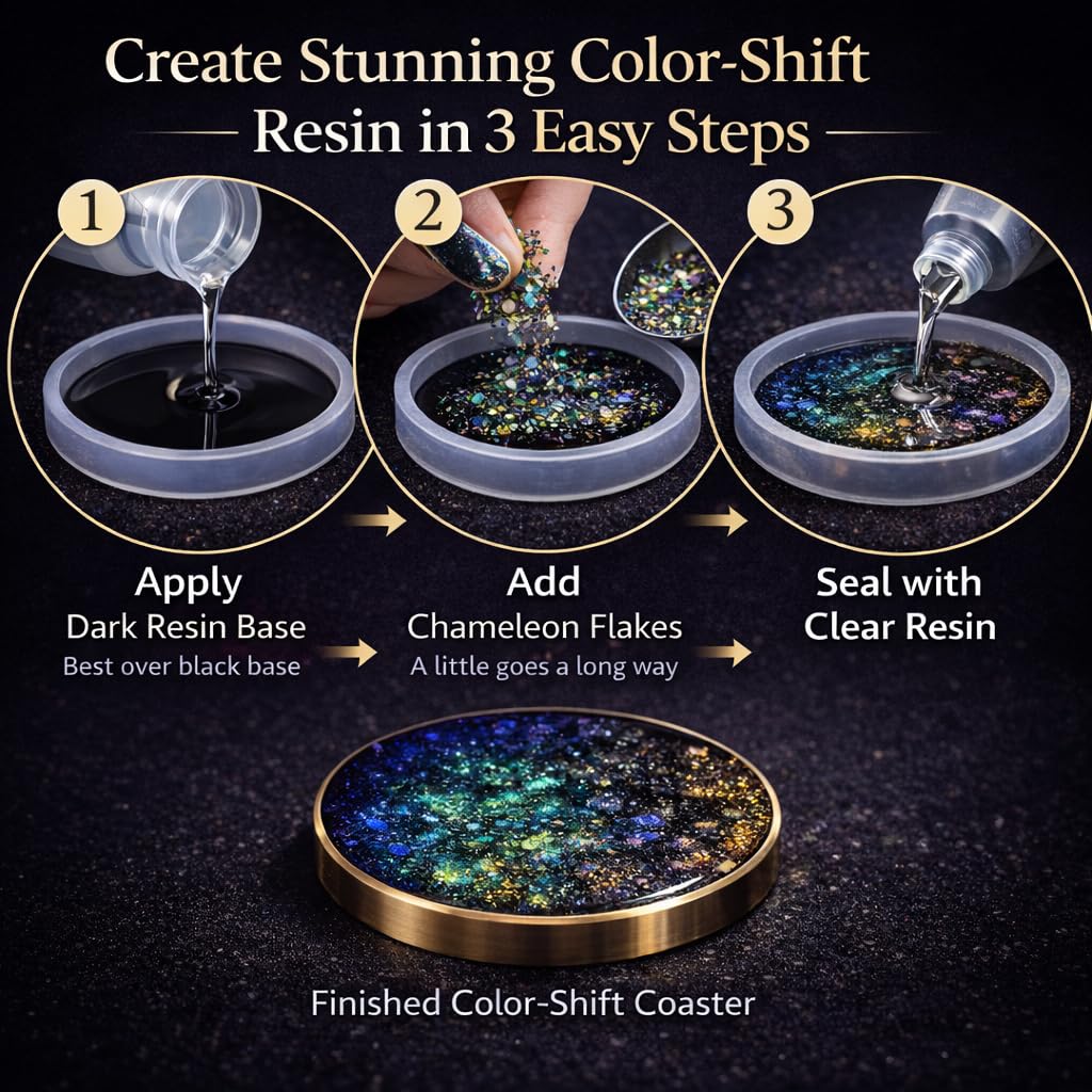 【 💜 CHAMELEON FLAKES FOR RESIN MOLDS 】- possibilities are endless. Ideal for DIY projects. Give an intense color shifting and shimmering final touch to your painting or other artwork. Brush the silicone resin molds with the chameleon pigment powder and then pour the black resin or just mix chameleon mica powder directly with resin and you will achieve the most professional results!