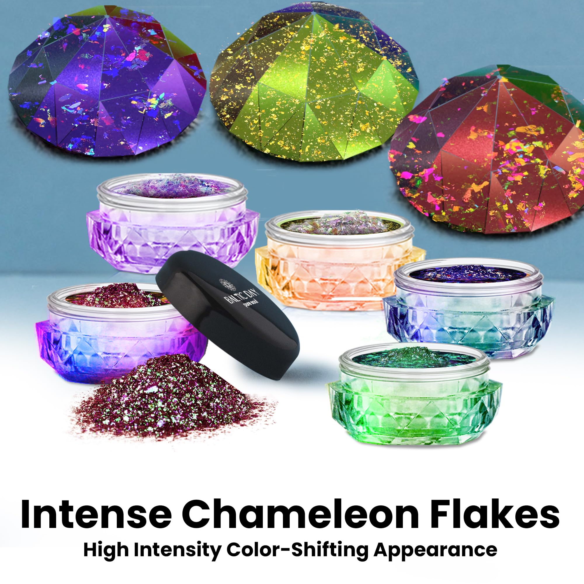【 ❤️ CHAMELEON FLAKES 】- The set includes 18 chameleon flakes, Each jar contains 0.3g bottles covering hues of all shades of Blues, Greens, Violets, Purples, Cyans, Golds, Brown, Pink, Copper. Highest quality chameleon flakes for resin have a color shift effect and are the highest grade of flakes available online! This unique flake will give off multiple colors in one piece. You'll need just a little to produce rich and vivid colors.