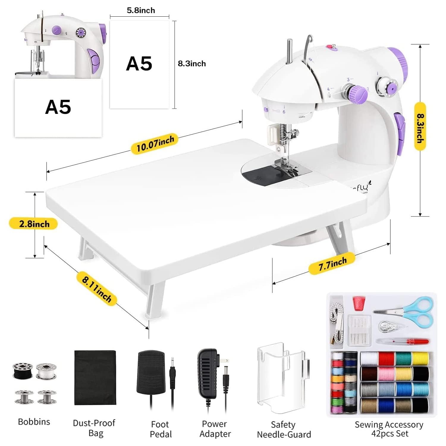 【Practical Sewing Kit】We provide a useful sewing accessory kit which includes bobbins (32pcs), needles (5pcs), scissors, threader, tape measure, seam ripper, thimble, and an extension table that makes the sewing machine more stable and improve its performance on larger projects. Additionally, a storage bag is included.