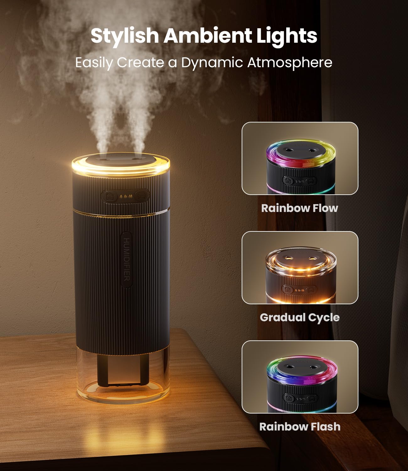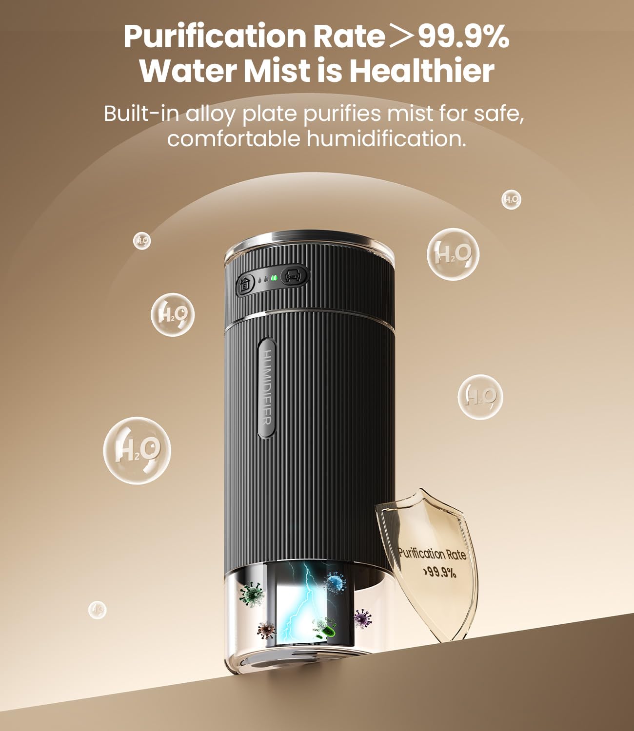 【Portable Travel Humidifier】This compact portable personal humidifiers (2.95'' x 2.95'' x 7.32'') features a handheld, anti-slip, and leak-proof design. Equipped with a 4000mAh long-lasting battery + 350ml capacity(it provides up to 6 hours of continuous mist). The perfect companion for your outdoor travel.