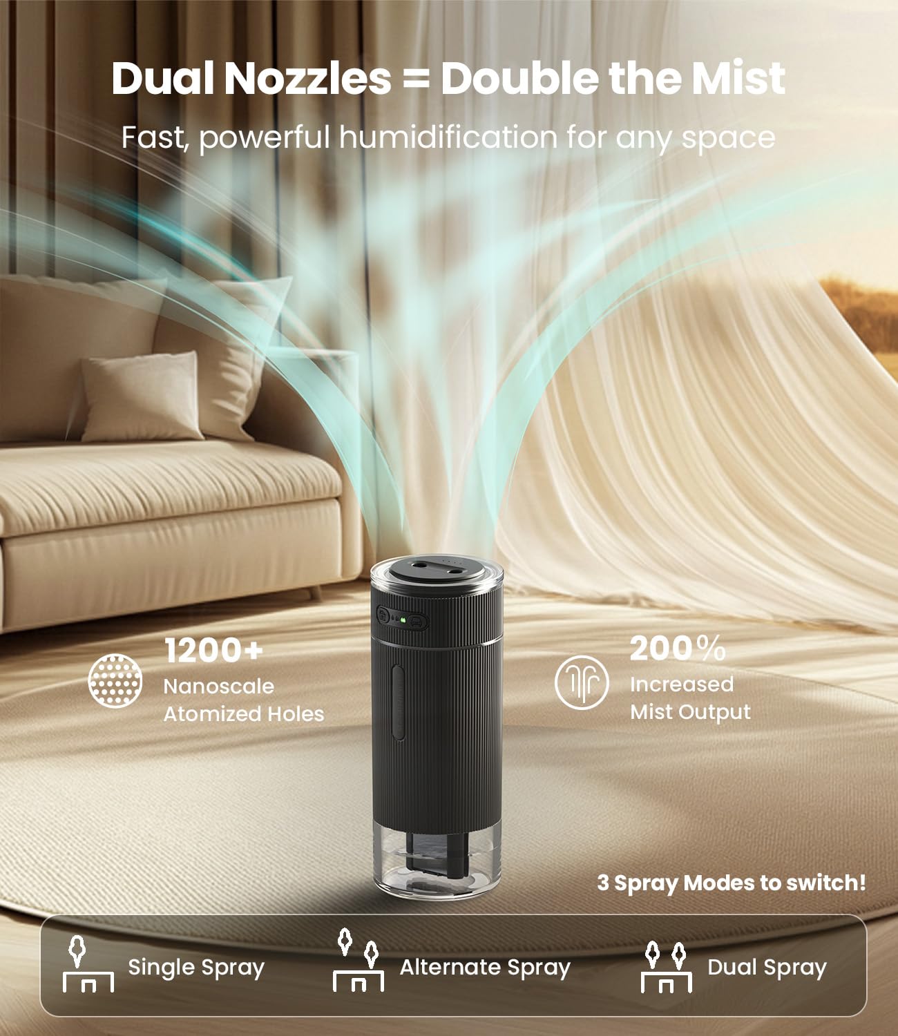 【Dual Nozzle - Large Cold Mist】This small ultrasonic air humidifier features dual-nozzle technology for powerful cool mist output, quickly and safely hydrating dry air. With 3 mist modes—single nozzle, alternating dual nozzles, and simultaneous dual nozzles—it’s perfect for the bedroom, baby room, car, office, and indoor plants.