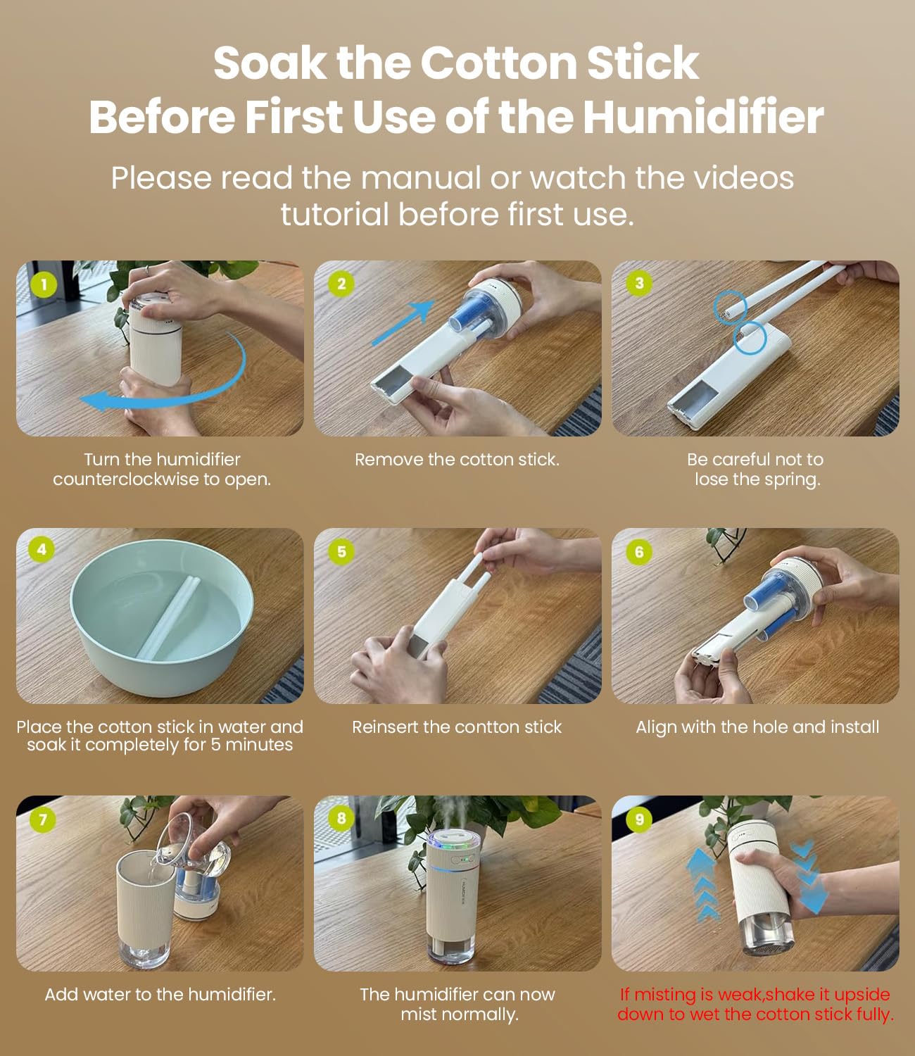 Troubleshooting-Precautions: Before using for the first time, please soak the cotton swabs for half an hour, then shake the humidifier back and forth to make the cotton swabs completely absorb water, the humidifier can be sprayed normally, you can view the online video tutorial.