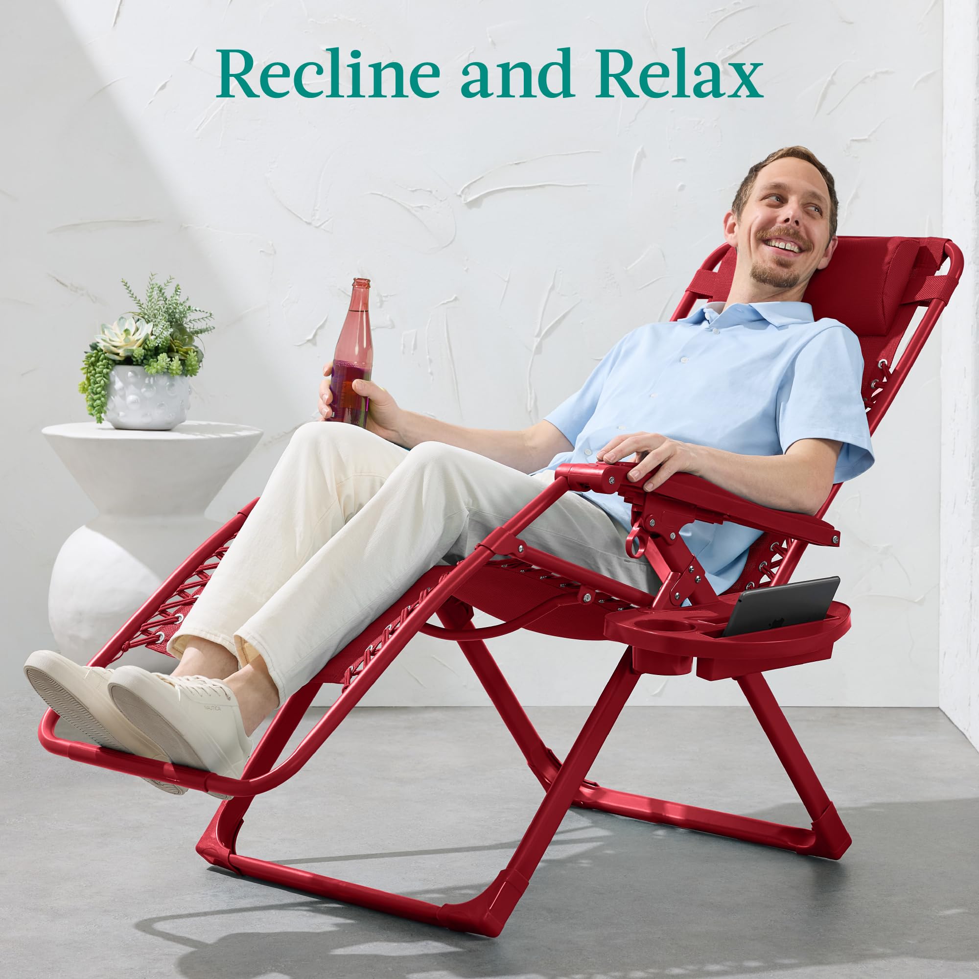 LOCKABLE RECLINING SYSTEM: Smoothly glide into an ergonomic zero-gravity position with removable elastic cords that immediately adjust to your body's weight