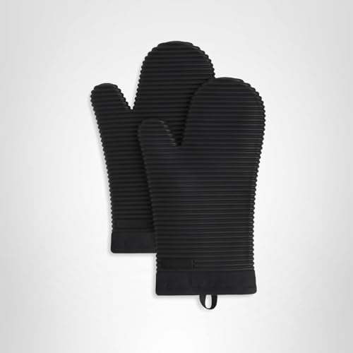 Perform your kitchen tasks safely with the KitchenAid Ribbed Soft Silicone 2-Piece Oven Mitt Set. The textured, ribbed stripe design offers a secure grip while handling hot objects. Made of durable and waterproof silicone with a cotton cuff that provides additional shield from the heat and polyester lining that offers comfort and insulation. Each oven mitt measures 7.5 inches by 13 inches for a generous fit. They are heat resistant up to 500 degrees Fahrenheit. Coordinate these oven mitts with coordinating KitchenAid Ribbed Soft Silicone Pot Holders for a complete set.