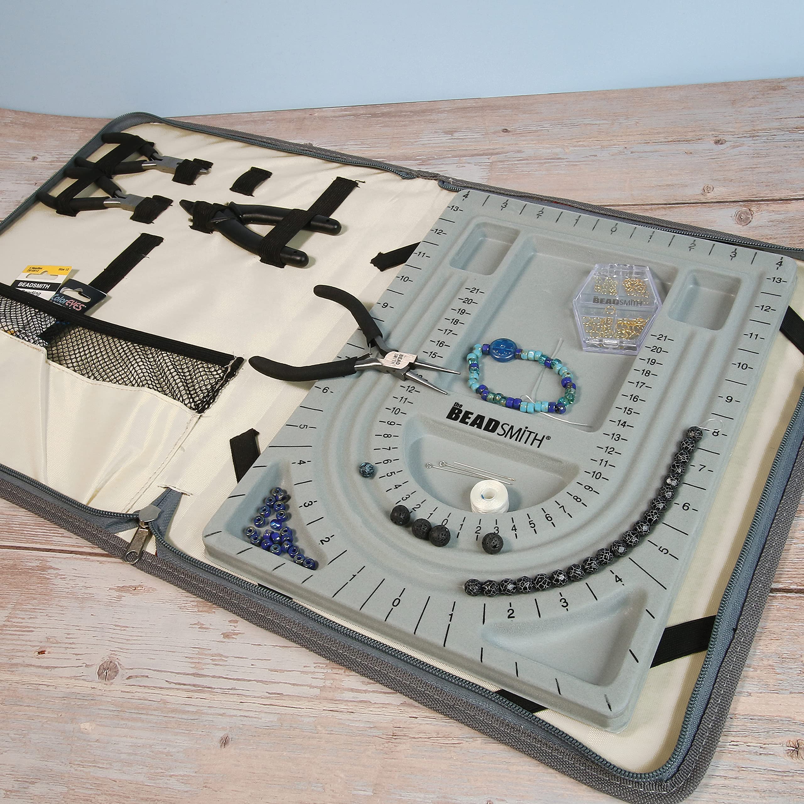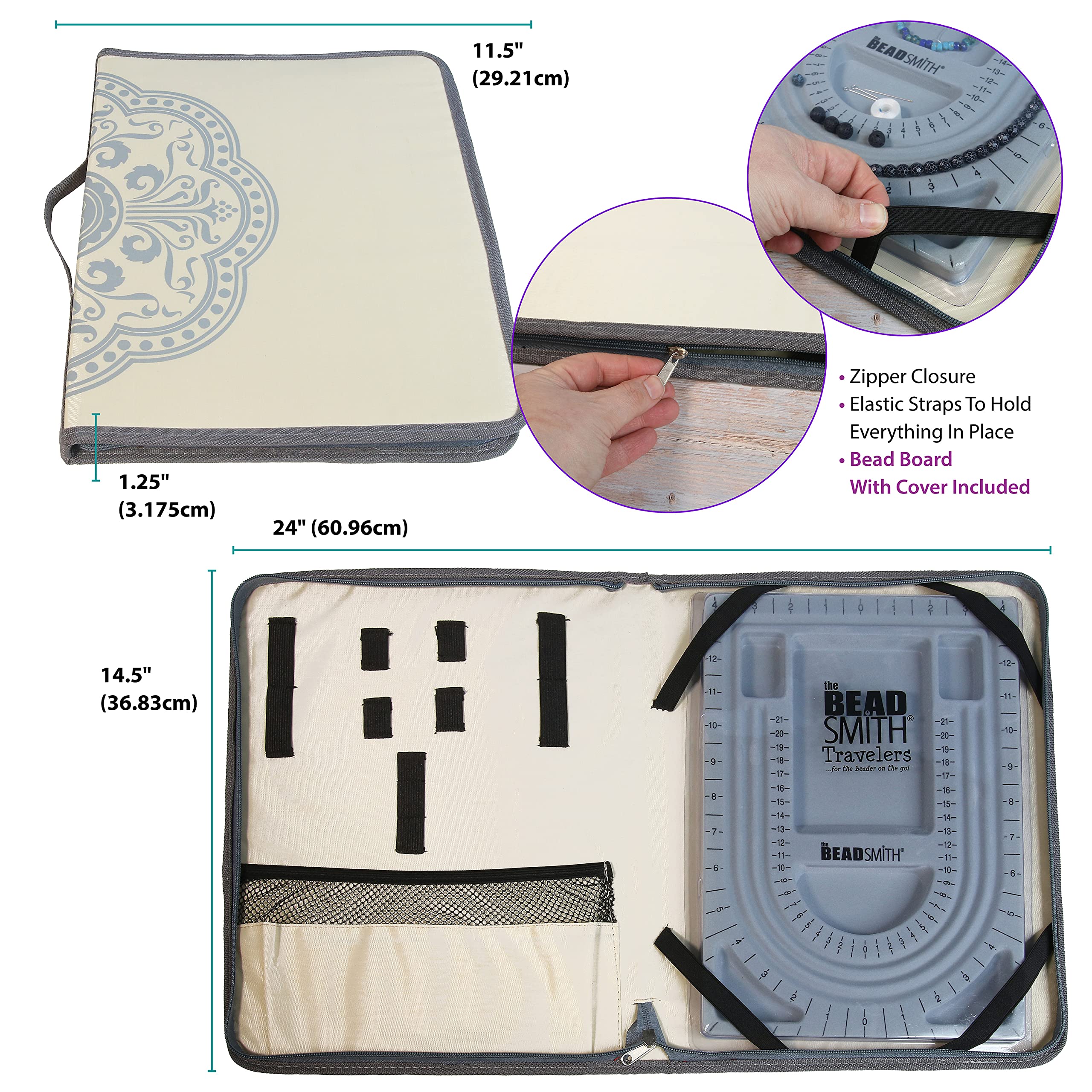 BEAD FOLIO: Our storage case is the perfect solution for beading on-the-go, working on a project while you travel or toting your partially made jewelry to your next bead class. The Bead Folio measures 11.5” x 14.5” x 1.25” and 24” across when fully open. The elastic straps and mesh pouch hold everything in place, while the zipper closure keeps everything inside. There’s also a carrying handle for easy transport.