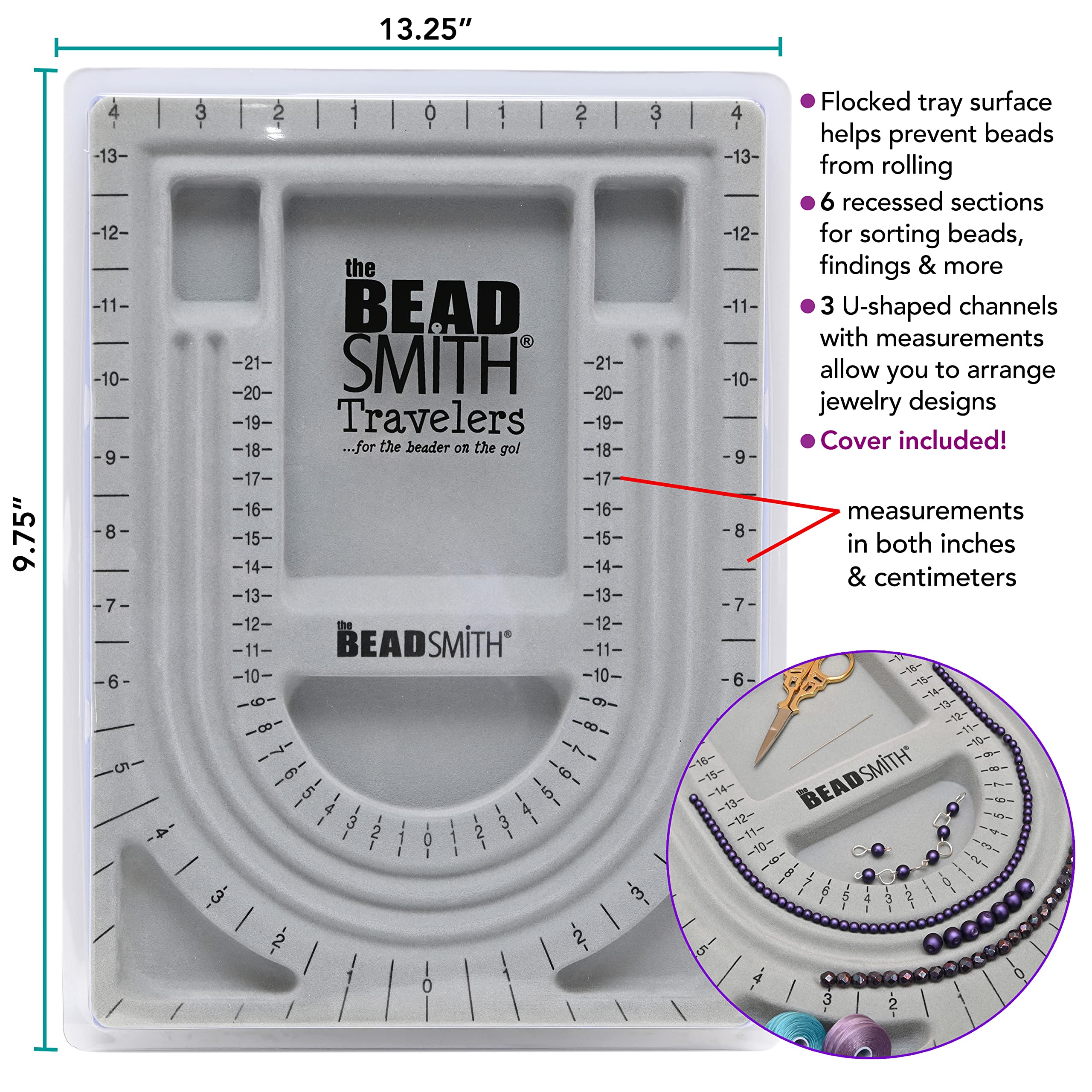 BEAD BOARD: Measuring 9.75” x 13.25”, this is our most popular size bead board. It features a flocked tray surface that helps prevent beads from rolling around, 6 recessed sections for sorting beads & findings and 3 U-shaped channels with measurements to preplan and design your jewelry. Included is a clear cover that fits over your board to keep everything in place.