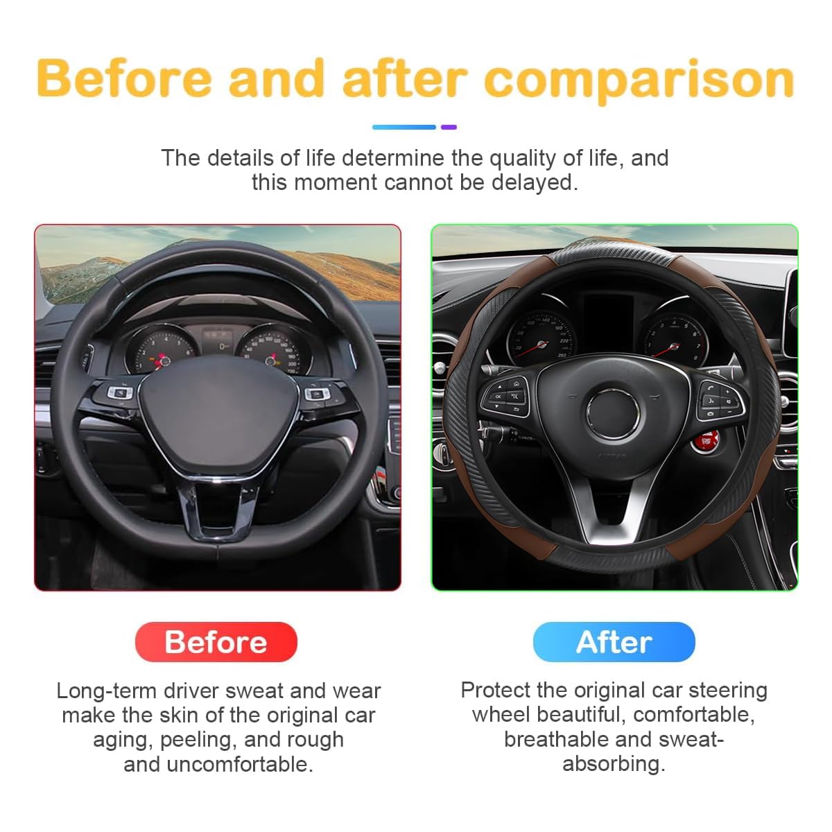 【Protection】: The full coverage design provides complete protection for your steering wheel, helping to protect the original steering wheel from scratches, aging, wear, fading, and dirt. It can be used for a long time, keeping your steering wheel with a refined look. With a new steering wheel, you will have a new mood and feeling every time you drive.
