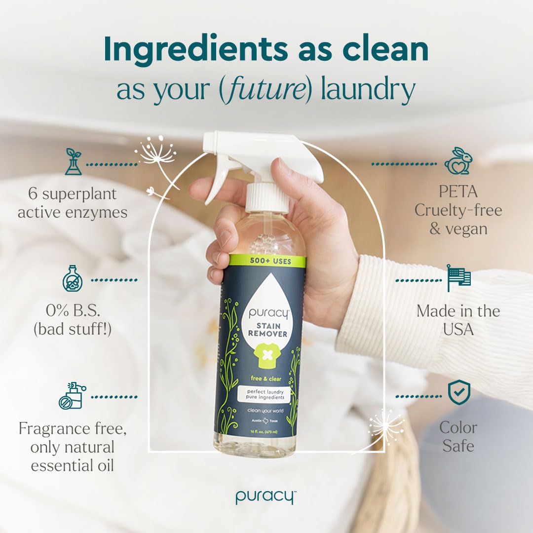 Gentle Yet Mighty Stain Remover - Puracy cleaning spray is meticulously crafted to gently yet powerfully tackle fresh and set-in stains. Ideal for unexpected moments, it efficiently removes stains, preserving the beauty of your cherished garments.