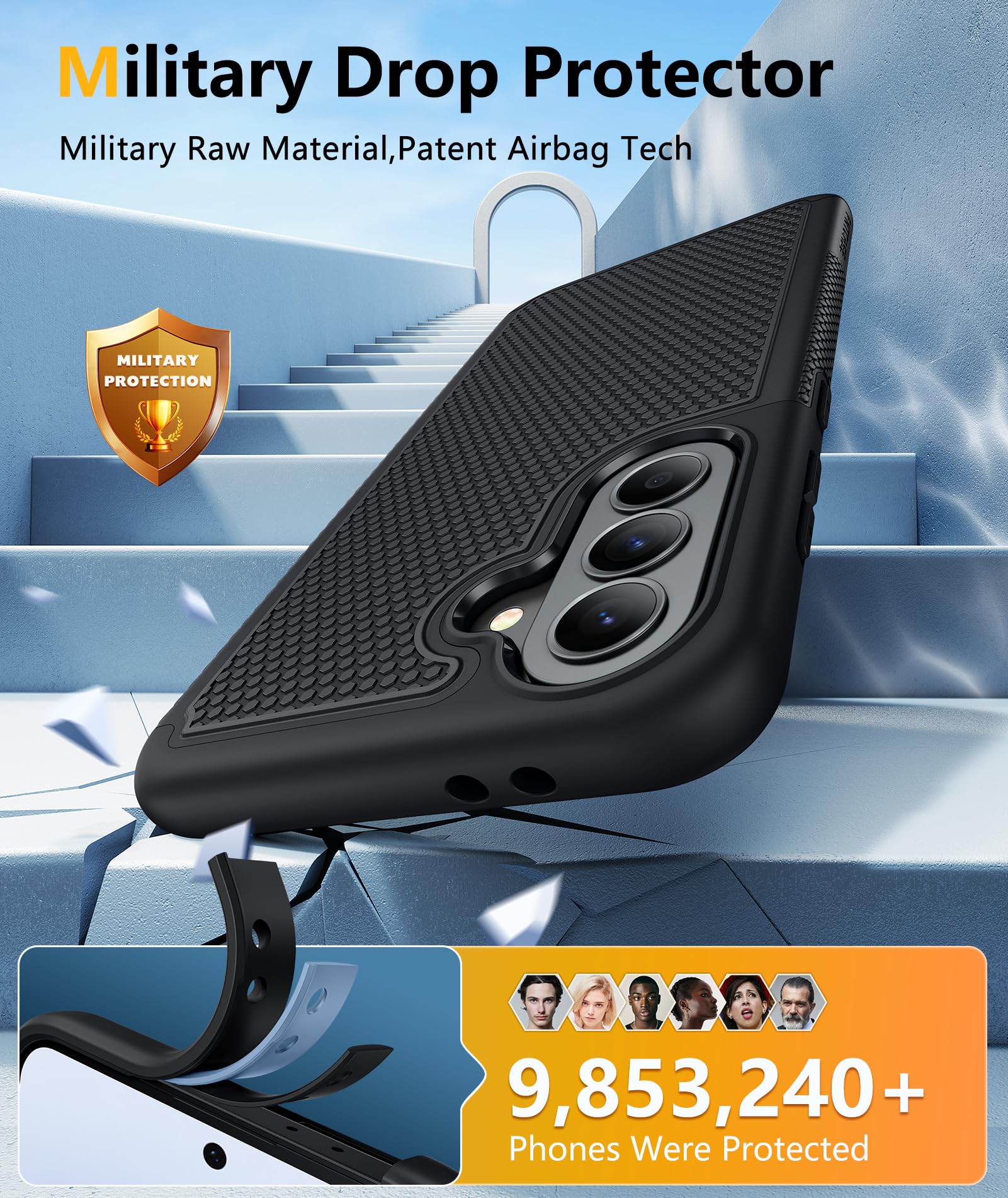 Dual-layer hybrid covers: A soft TPU inner case, four-corner airbags and honeycomb inner design for shock absorption and heat dissipation, a hard PC back outer shell for strong impact resistance against accidental drops, 14-foot military-grade drop protection. 2.0mm raised bezel camera guard, and 1.5mm raised front edge to prevent screen scratches