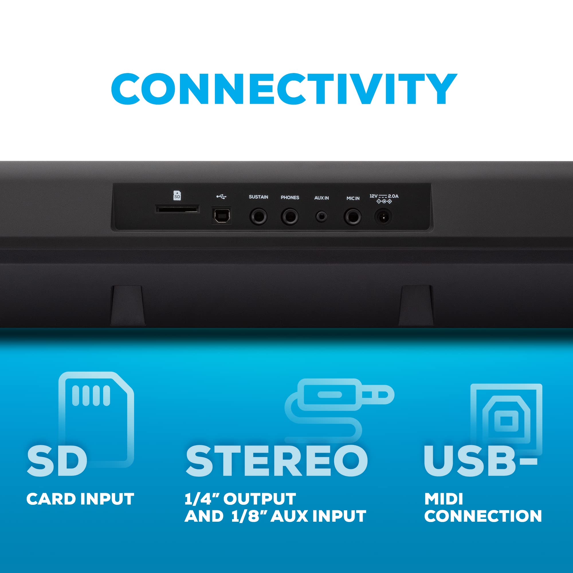 Connections - 1/4” Stereo out to practice with headphones or connect to external speakers; 1/8” AUX input for playing along with a mobile device