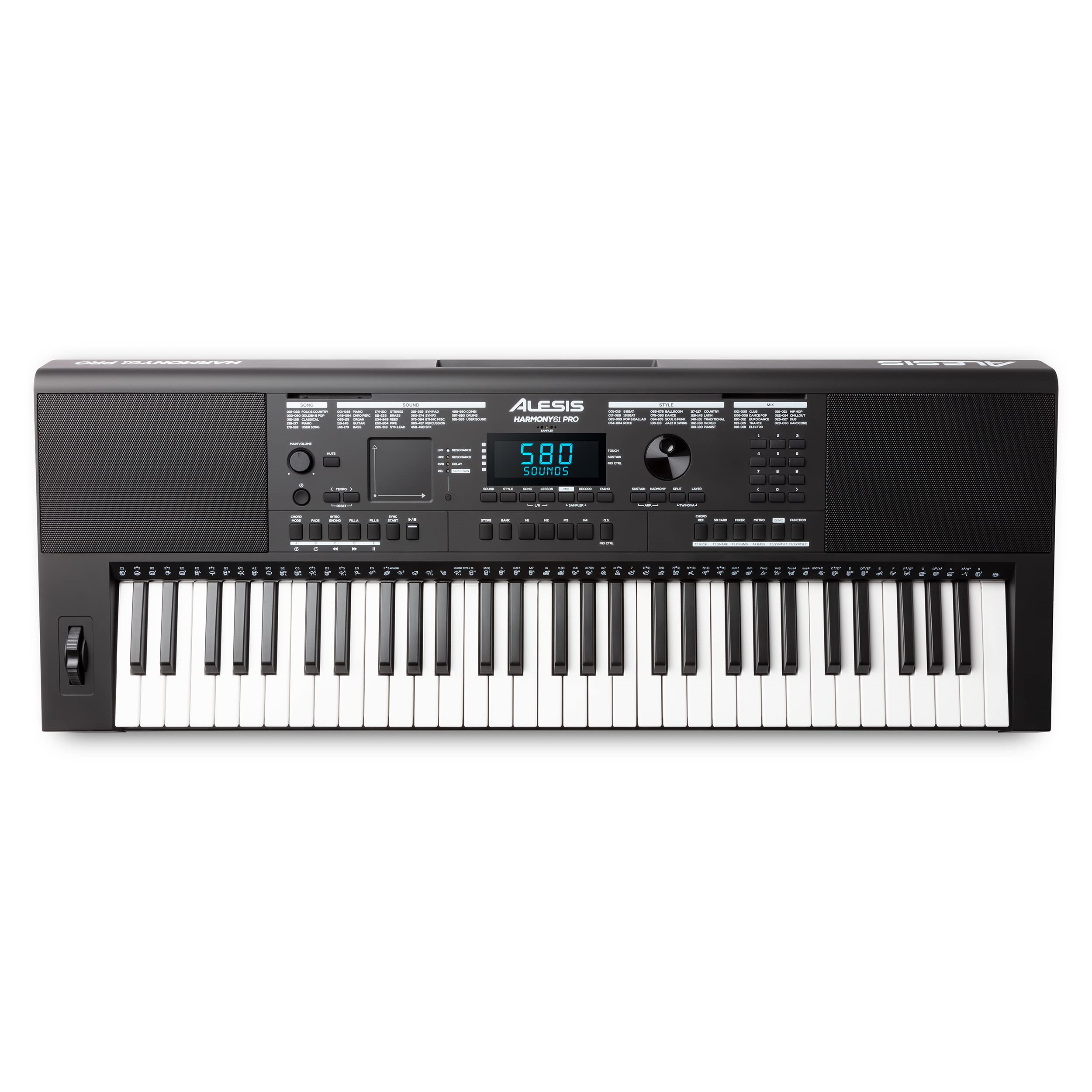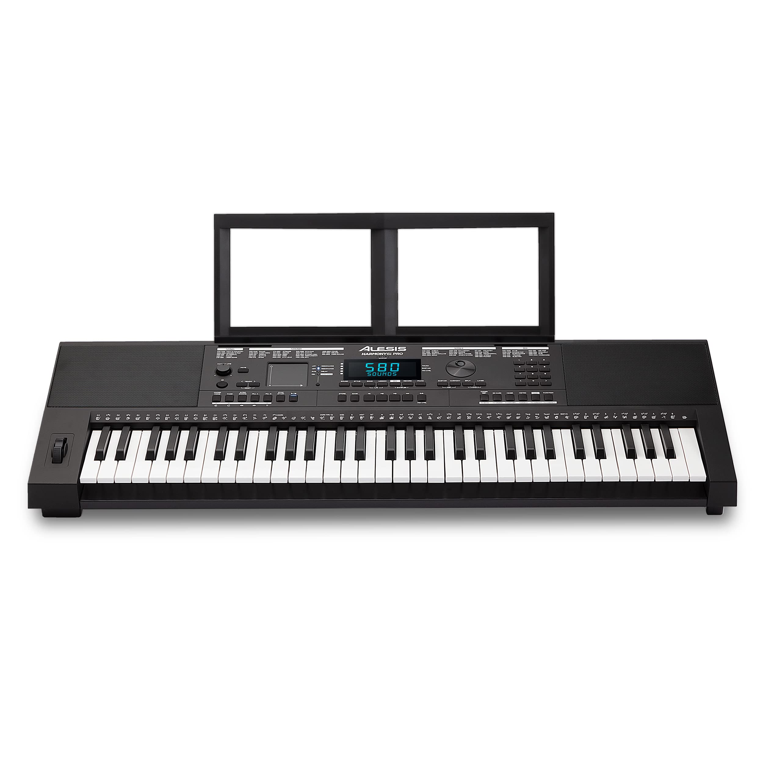 Feature Packed Perfect for both beginners and experienced players, kids and adults, the Alesis Harmony 61 Pro Electric keyboard piano combines 61 premium touch-sensitive keys with adjustable touch response, an enormous sound library with play-along songs and rhythms, and an easy-to-use control set including a pitch-bend wheel and a X/Y performance touchpad with DJ-style FX for additional expression. Realistic Sounds Harmony 61 Pro features 580 built-in sounds you can layer together in “Dual” mode or split two sounds across the keyboard in “Split” mode. 177 built-in demo songs with step-lesson mode and 180 built-in accompaniment rhythms that enable you to instantly create songs. Featuring on-board FX, including 10 Reverb, 8 Chorus, and 2 slicer effects for additional depth. Built-In Recorder and Chord Dictionary Harmony 61 Pro’s features a backlit LCD screen with notation and a built-in chord dictionary. Record your performance in CD quality as a .WAV file (16-bit, 44.1kHz) via the SD card input. Includes 60 Interactive Piano Lessons from Melodics Download Melodics for practice that’s fun, relevant & effective, with huge lesson variety and a learning structure that puts you in charge. Includes 3-Months of Piano Lessons from Skoove Develop your repertoire with a curated catalog filled with everything from current chart hits to classical music.