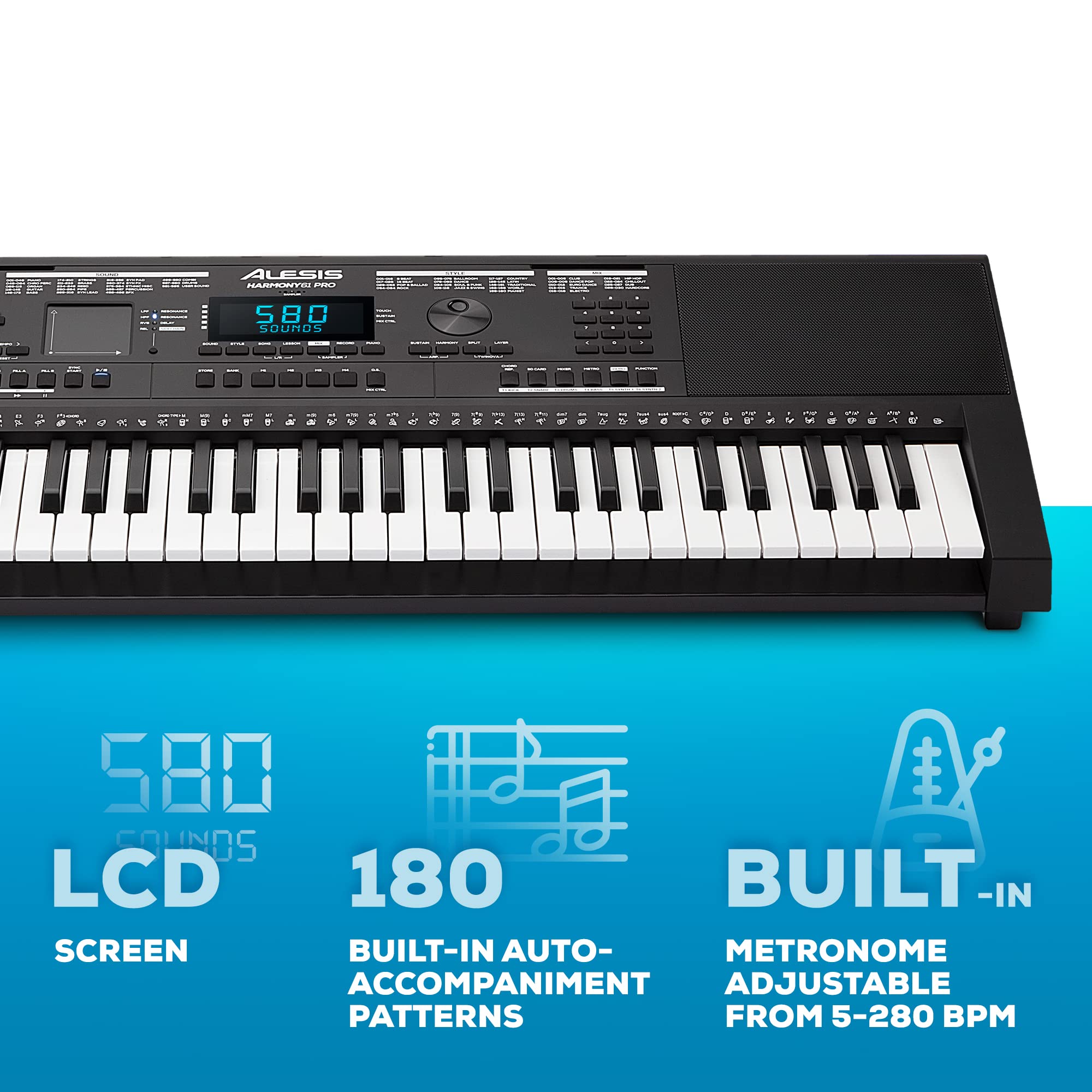 On-board FX - Including 10 Reverb, 8 Chorus, and 2 Slicer effects for adding additional depth to your sound; 180 built-in auto-accompaniment patterns and built-in metronome adjustable from 5-280 BPM