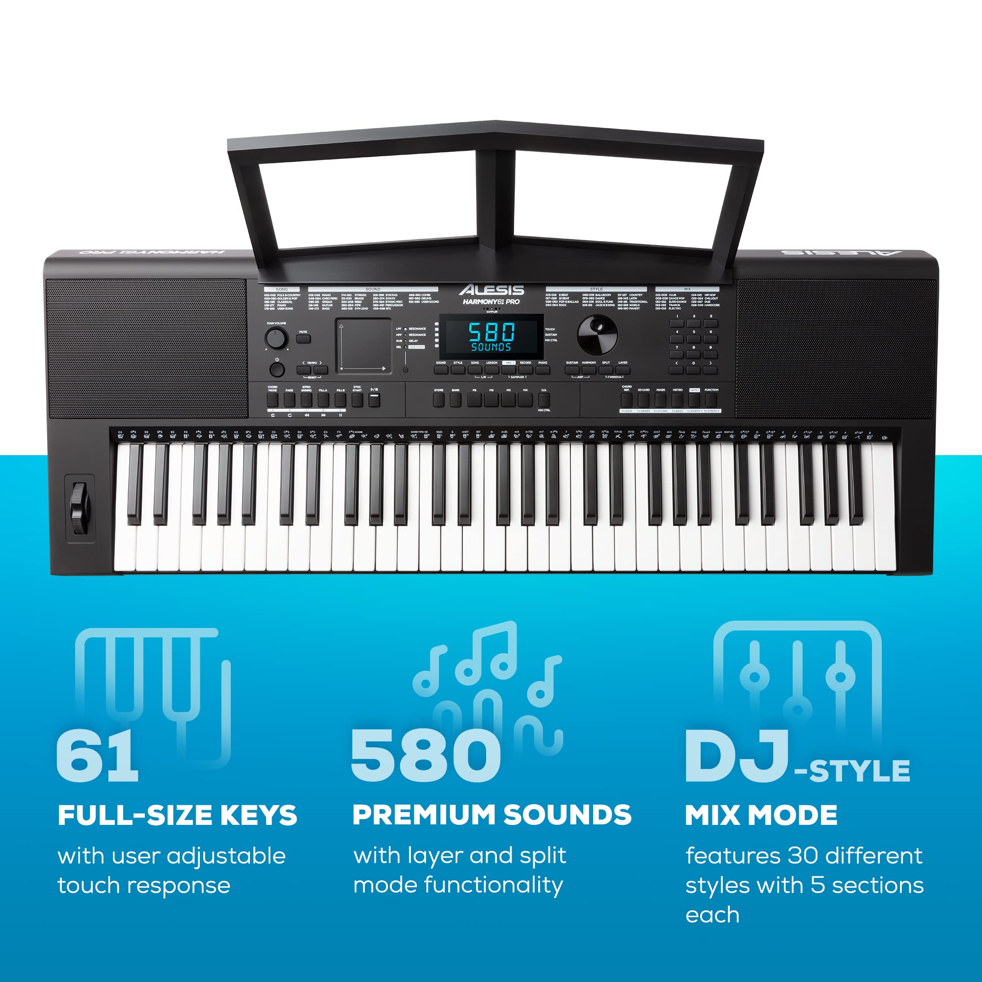 Electronic keyboard with 61 full-size keys, user adjustable touch response, pitch-bend wheel, X/Y performance touchpad, Mix mode with DJ-style FX, and 30 different styles with 5 sections each