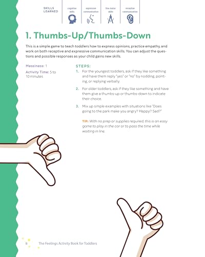Help toddlers build their emotional intelligence Your little one is starting to develop stronger emotions and opinions―but they don't always know how to cope with them in healthy ways. This activity book is here to help. It's full of fun games and activities that help kids ages 1 to 3 learn how to process their feelings and regulate their reactions. Play with purpose―From Mad Monster to Paper Plate Faces, enjoy 50 exciting activities that show toddlers how to build empathy and manage emotions like anger, sadness, and excitement. Clear guidance―Make the most of each activity with step-by-step instructions and advice on how to encourage toddlers to open up about their feelings. Total flexibility―These games can be enjoyed in any order; flip through and find one that works for your time frame and your toddler's current interests and skill level. Help your child build emotional intelligence with this fun-filled feelings book for toddlers.