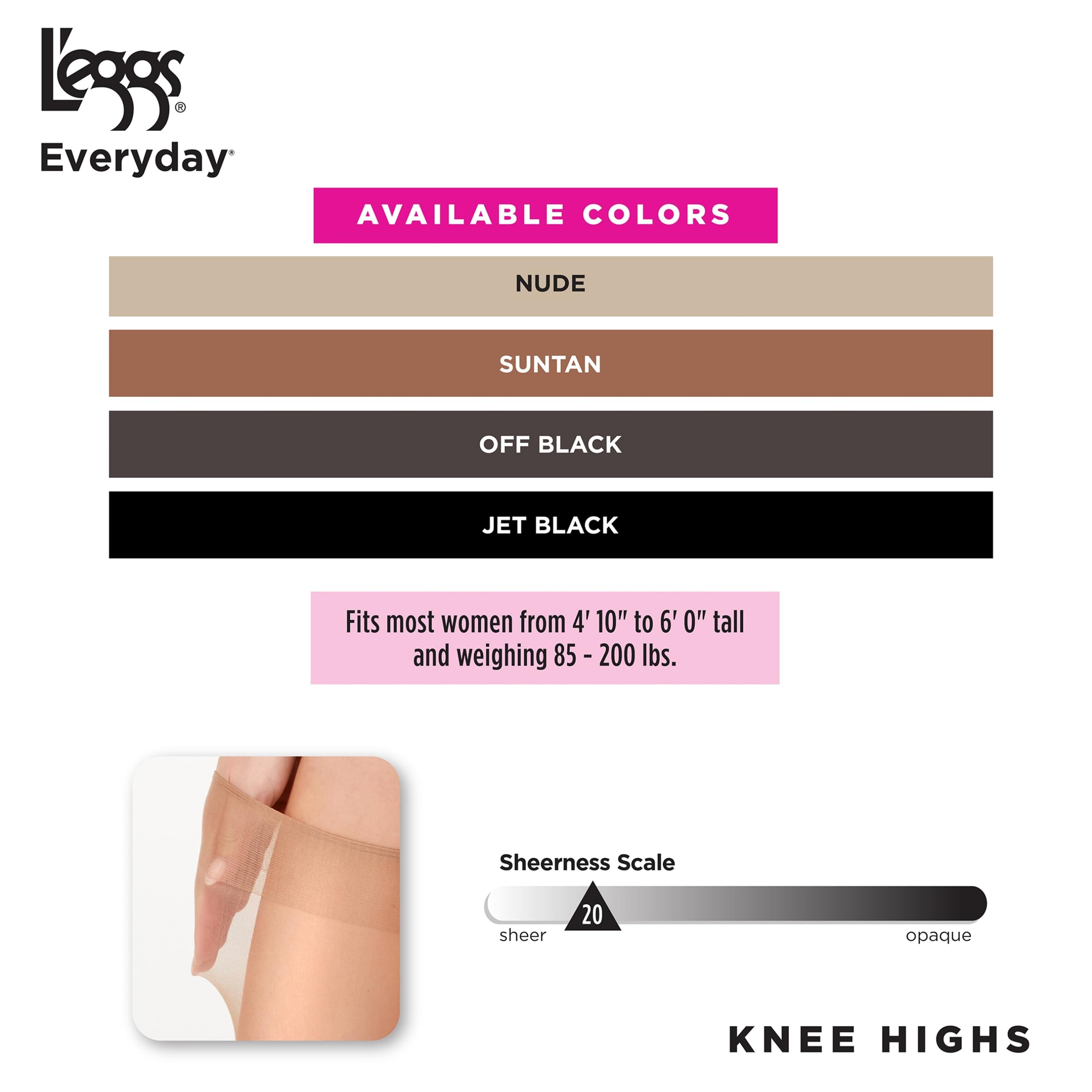 Description Enjoy the classic fit and quality of the trusted L'eggs brand in everyday day sheer knee-highs. L'eggs Everyday Women's Knee-Highs are a light and comfortable wardrobe staple. These beautiful day sheer knee-highs provide light leg coverage, suitable for all wearing occasions. The classic knee-high length adds a touch of sophistication to any outfit, while the neutral tones effortlessly complement a variety of styles and ensembles. Whether paired with skirts, dresses, or trousers, these stockings effortlessly elevate your look with a polished finish. L'eggs Everyday Women's Knee-Highs are designed with your lifestyle in mind. The sheer toe feature allows you to seamlessly pair them with open-toe shoes or sandals, ensuring you never have to compromise on style. Whether you're dressing up for a formal event or adding a touch of elegance to your everyday look, these pantyhose are your go-to for versatile fashion. L'eggs Everyday Women's Knee-Highs elevate your style with timeless elegance and unmatched comfort. Step into effortless style with L'eggs Everyday Knee-Highs, featuring a delicate 20 denier sheer design that offers light, elegant coverage. These knee-highs enhance your look by subtly concealing imperfections, creating a smooth and polished foundation for any outfit. Perfect for work or play, they deliver the confidence you need to step out looking flawless every time. Constructed with quality materials and expert craftsmanship, L'eggs Everyday Women's Knee-Highs offer unbeatable value and style. Treat yourself to comfort, durability, and grace with this essential wardrobe staple. Whether you're heading to the office or stepping out for a special occasion, L'eggs Everyday Women's Knee-Highs elevate your style with timeless elegance and unmatched comfort.