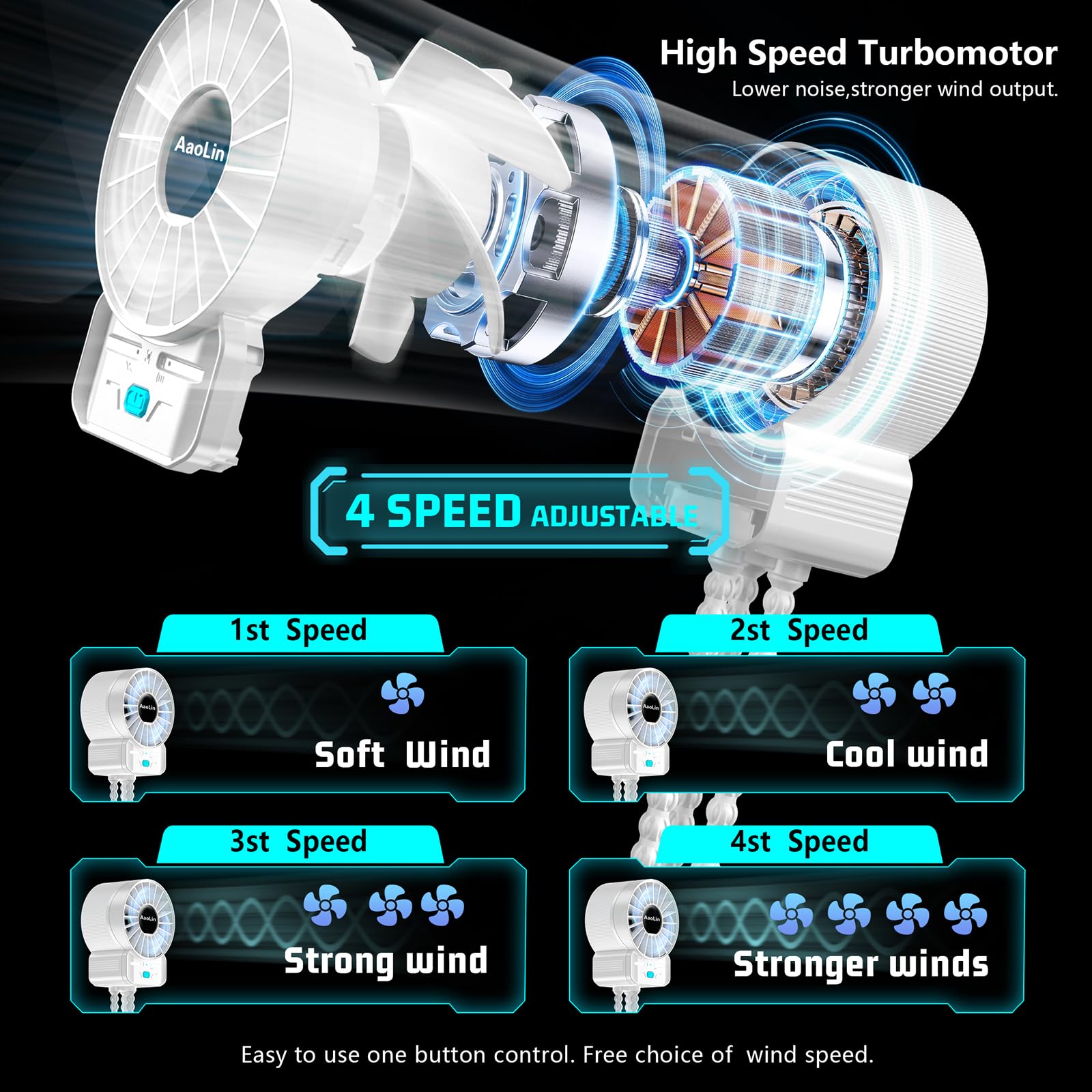【4 Speeds and Quiet】-AaoLin small portable fan built-in high speed brushless motor,It can provide powerful airflow but is quiet.It comes with 4 speeds for different purpose,Its highest gear has a speed of 6600rpm.Summer gifts for kids,travel beach cruise ship essentials,very practical stroller accessories!
